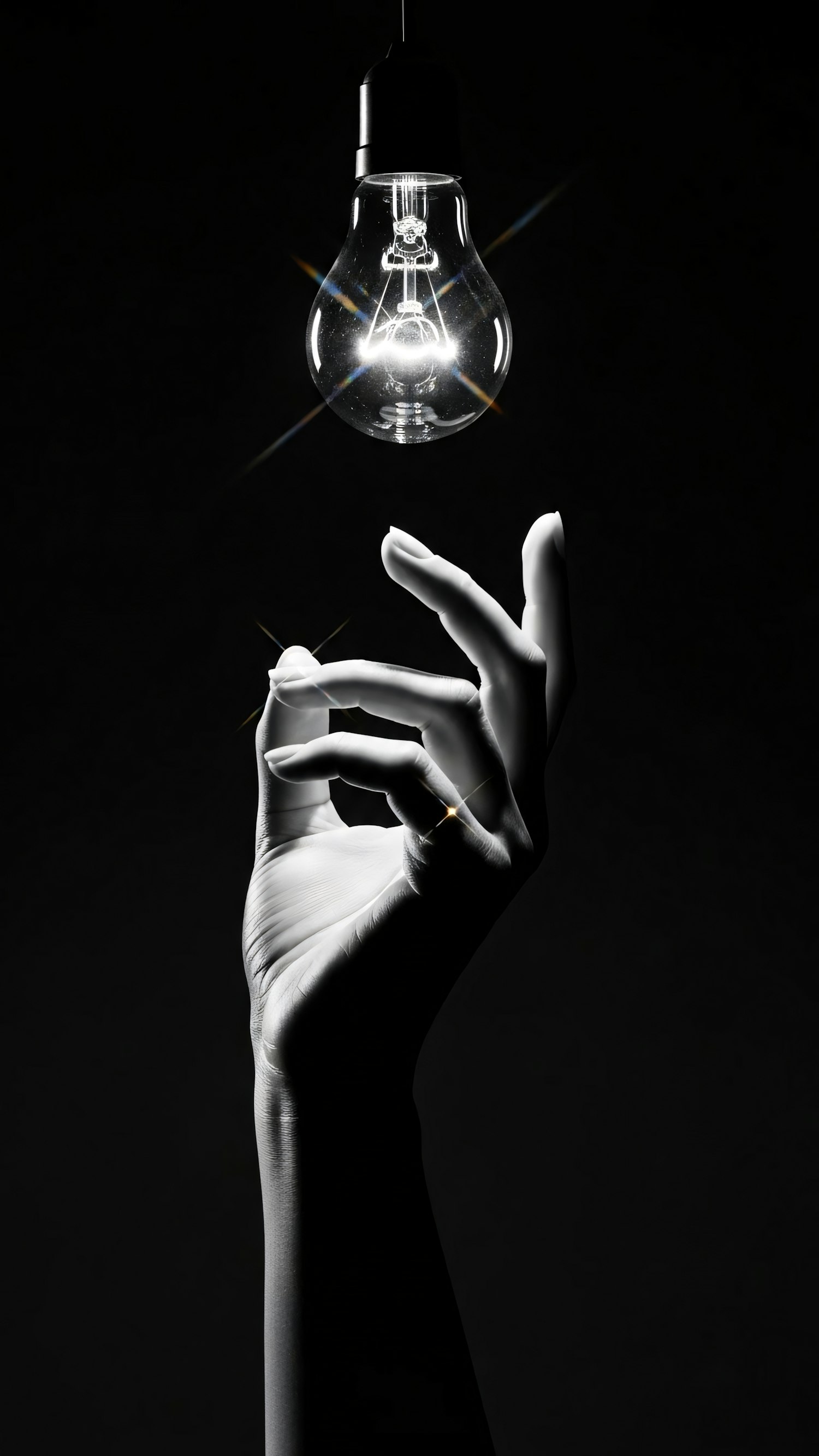 A striking black-and-white image of a hand reaching towards a glowing light bulb, emphasizing light and shadow contrasts.