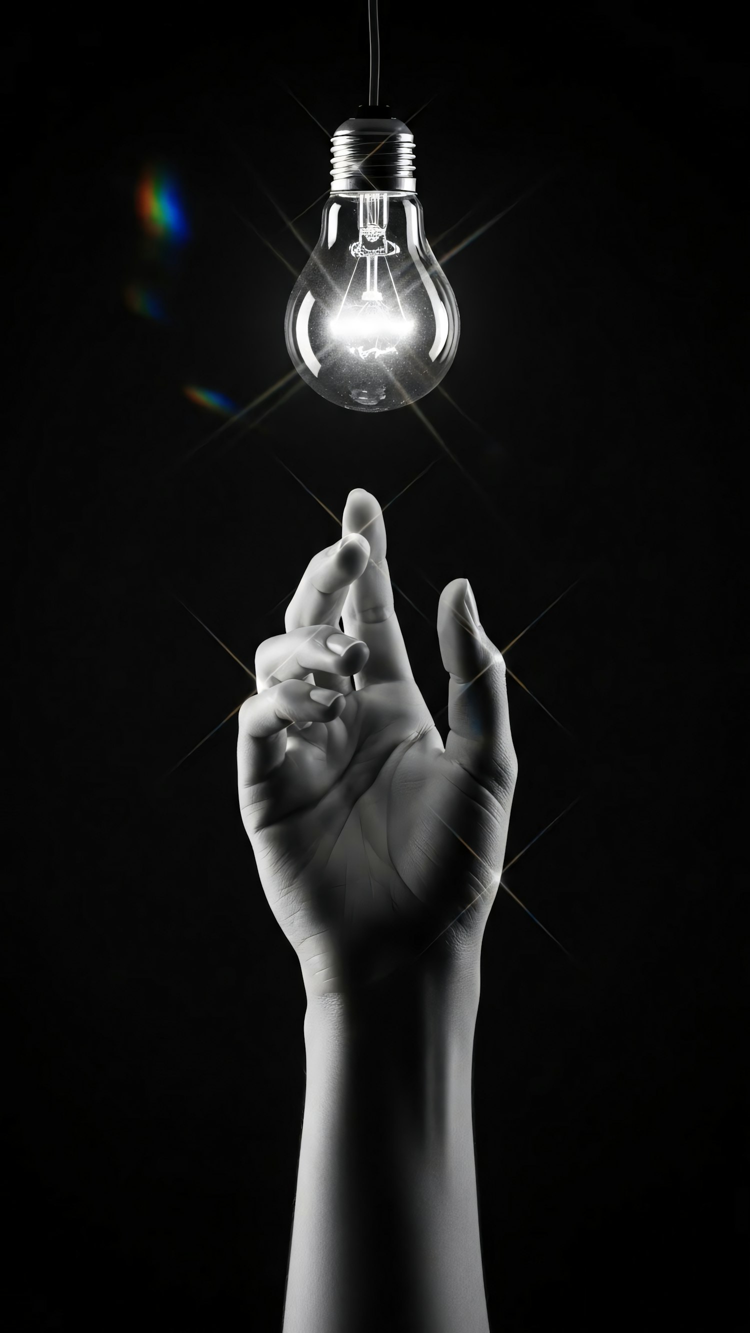 A hand reaches towards a glowing light bulb in a dark setting, symbolizing inspiration and creativity in a striking monochromatic style.