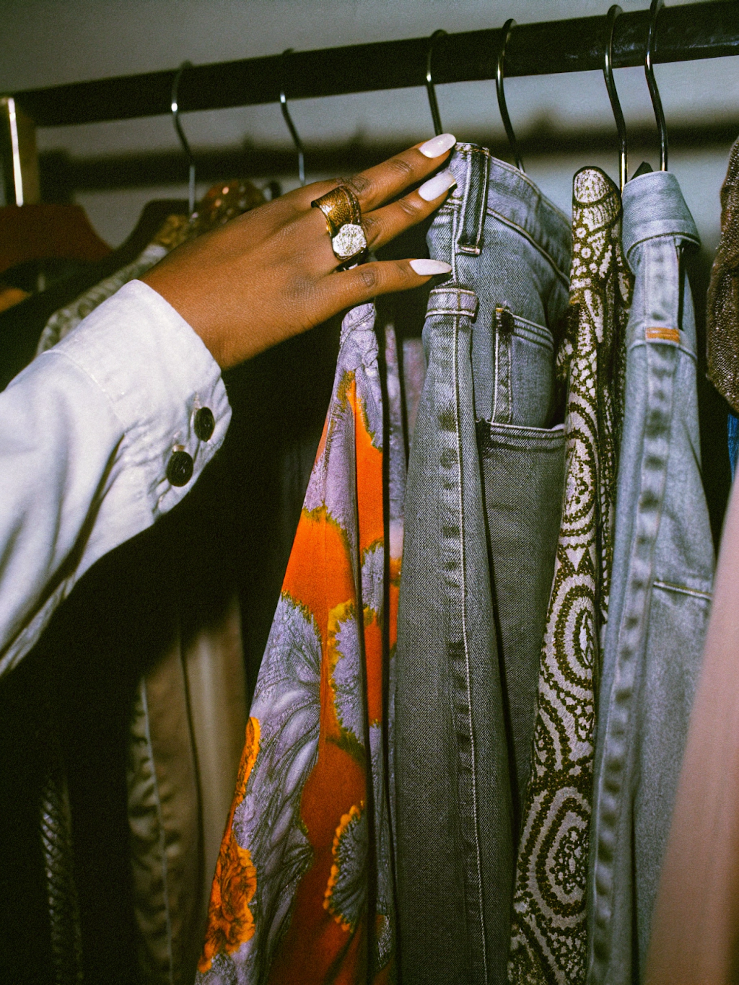 A hand with a gold ring browses a clothing rack with denim, floral, and paisley patterns, showcasing vibrant and stylish fabrics.