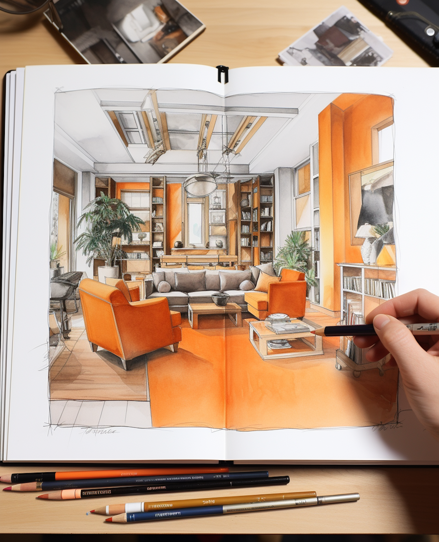 Artist sketching a vibrant living room design with orange accents and modern decor in a sketchbook, surrounded by colored pencils.
