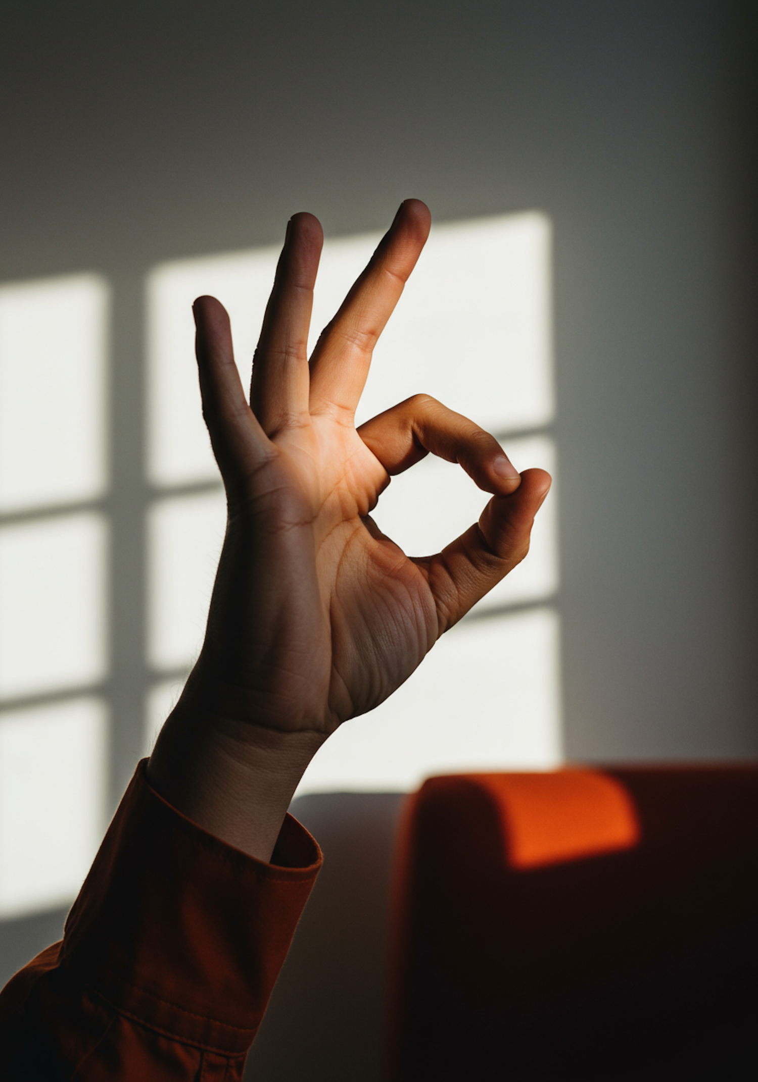 A hand making an 'OK' gesture in warm natural light, with a shadowed wall and a red chair in the background.