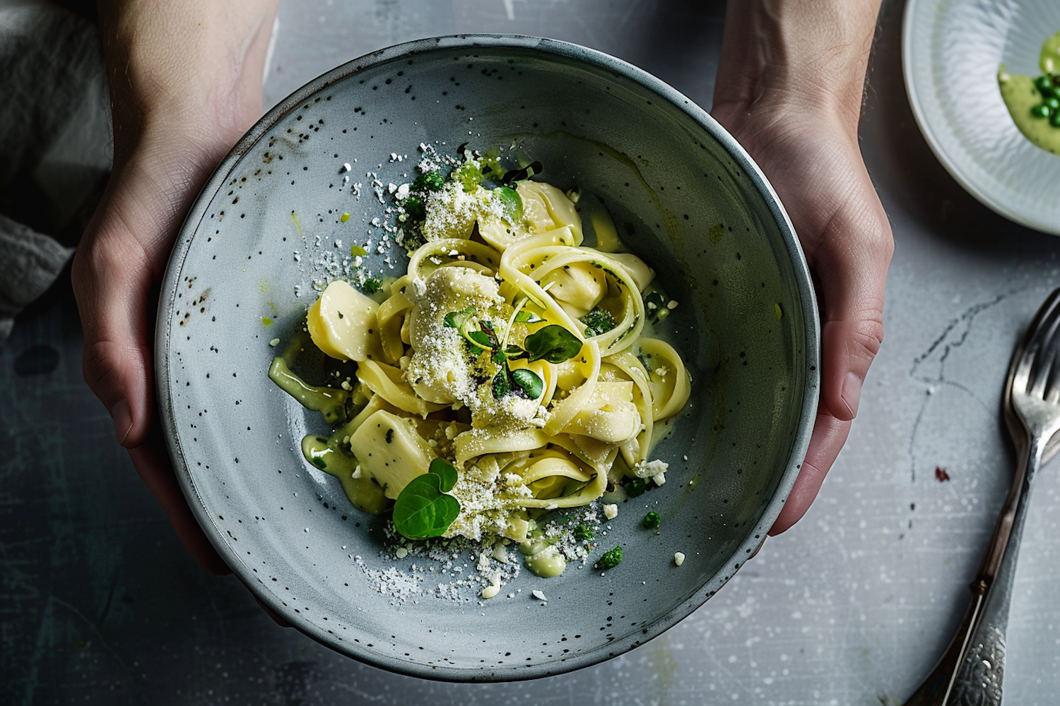 Hands holding a bowl of creamy fettuccine pasta with cheese and herbs on a rustic table setting.
