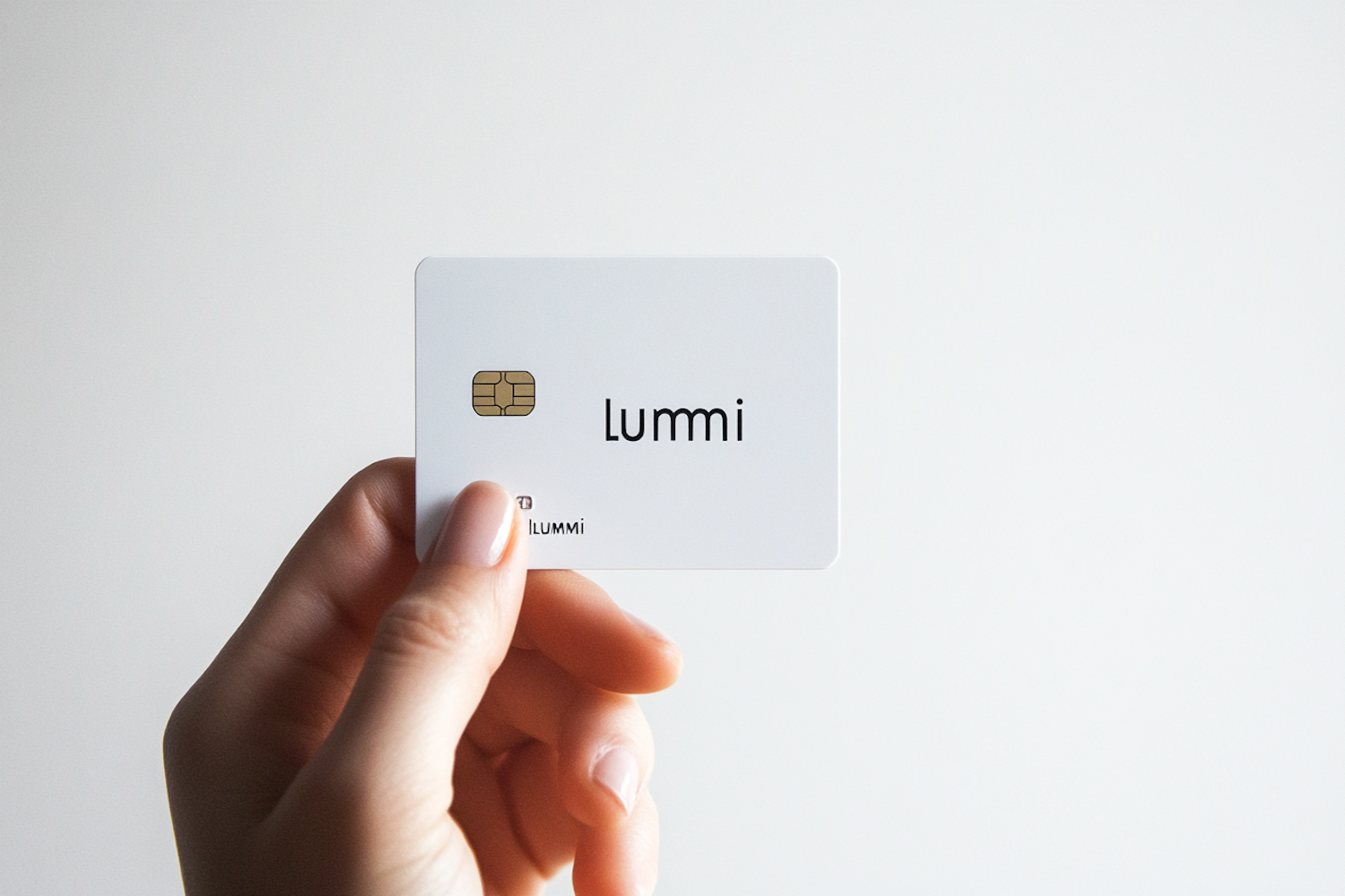 Minimalistic image of a hand holding a white card with 'Lummi' text and a gold chip, set against a plain background.