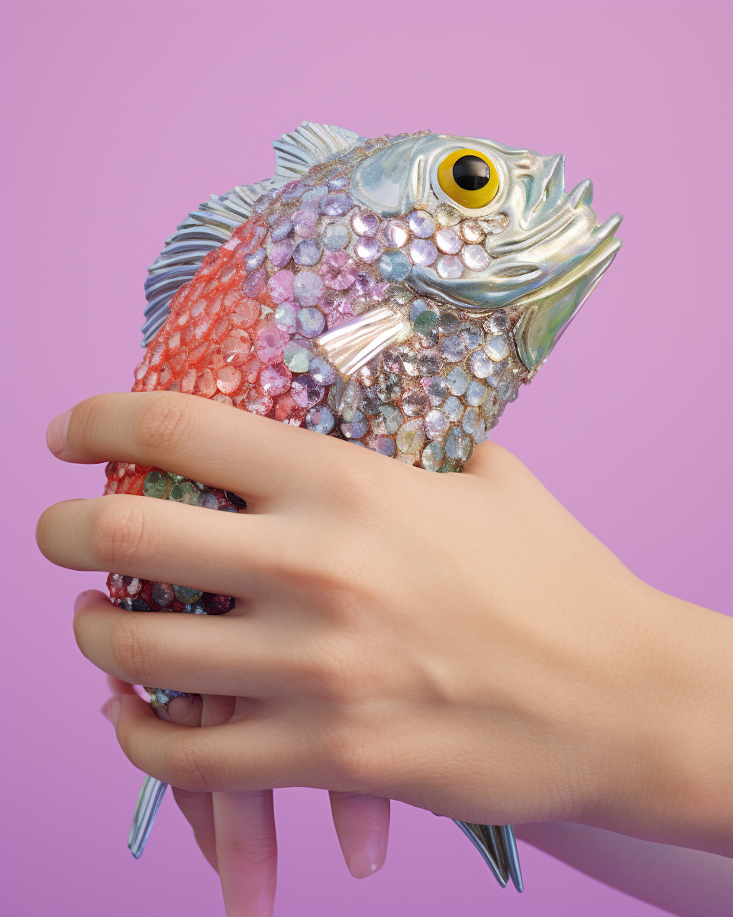 Hand holding a gemstone-encrusted decorative fish sculpture with metallic accents against a pastel purple background.