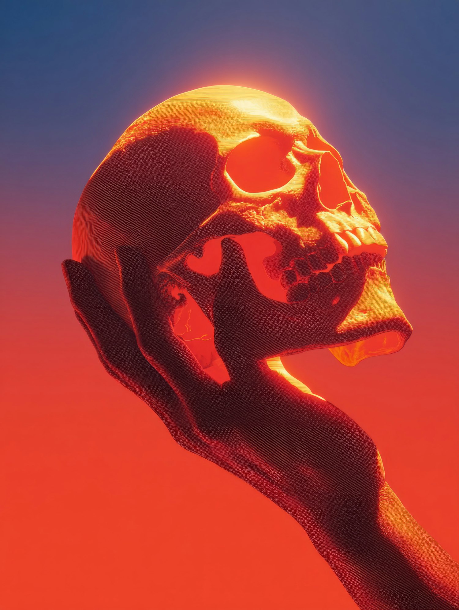 A vibrant artistic depiction featuring a hand holding a skull against a gradient backdrop; captivating use of colors and details.