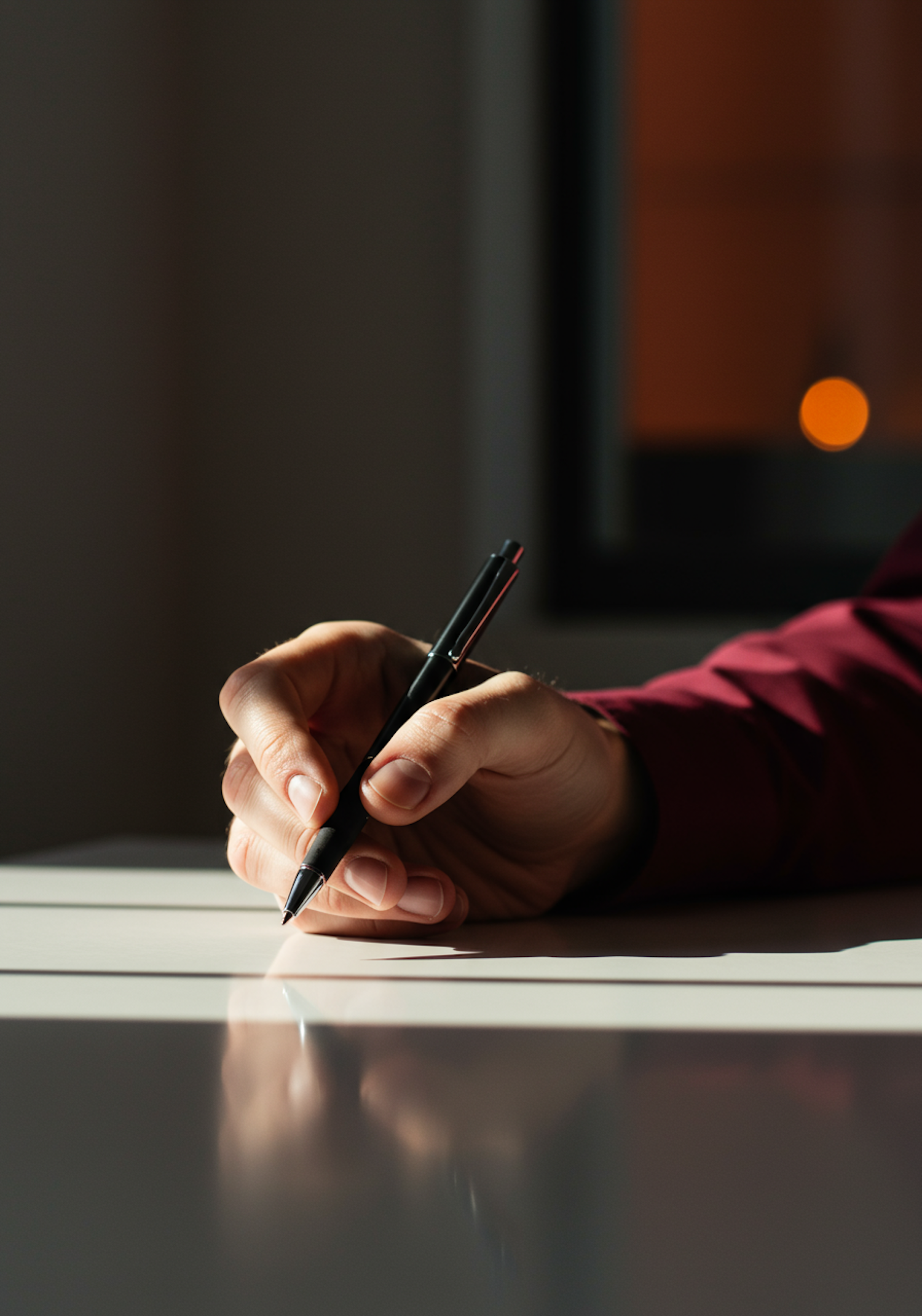 Close-up of a hand holding a black pen over a white surface, with soft lighting and a blurred background featuring a warm orange light.