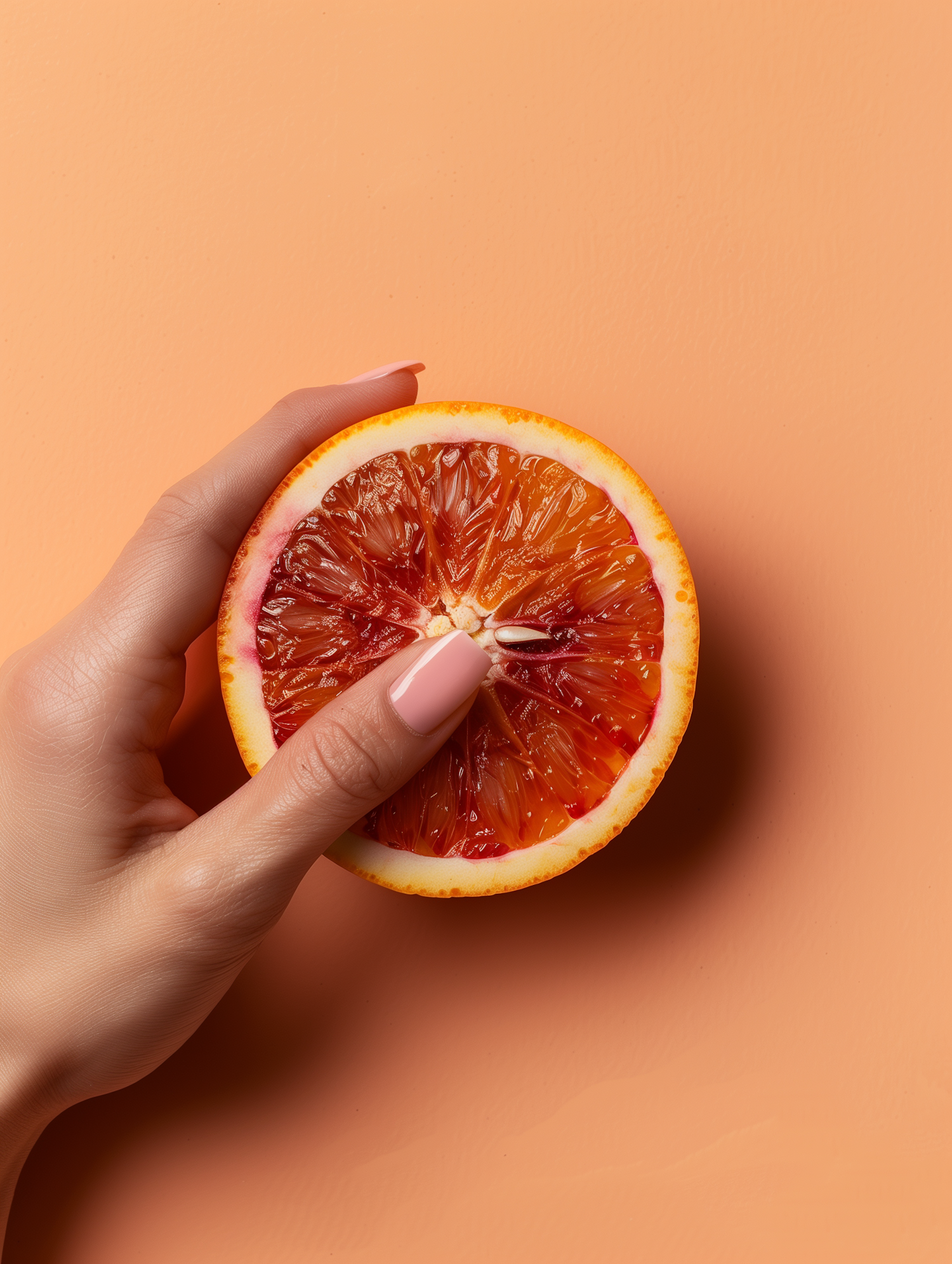 A manicured hand holds a vibrant blood orange half against a peach background, highlighting the fruit's rich colors and juicy texture.