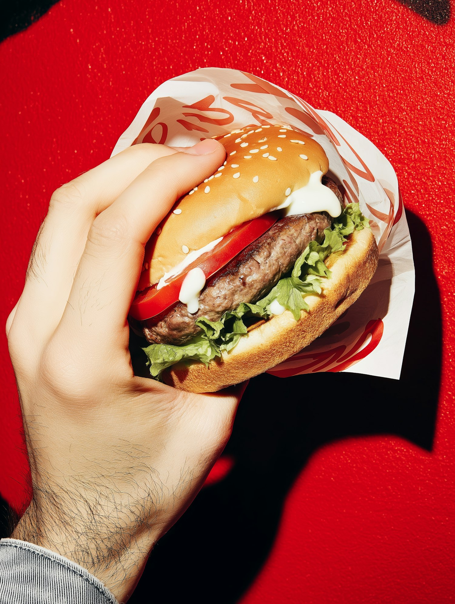 A hand holding a fresh hamburger with lettuce, tomato, and mayonnaise against a bold red background, showcasing vibrant colors.