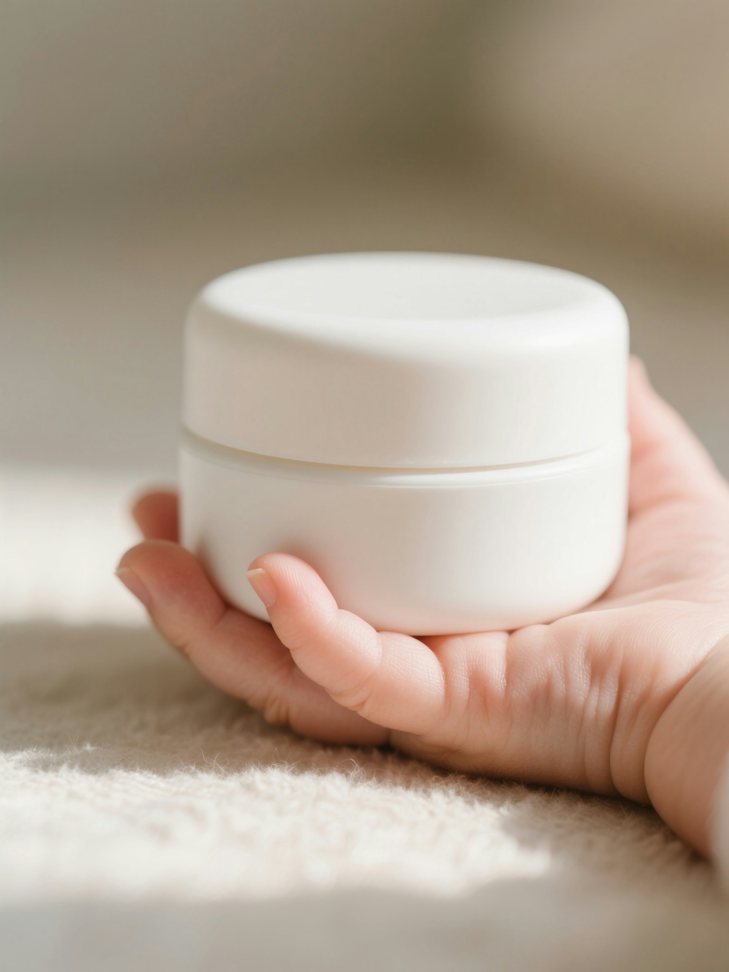 A hand gently holding a white round container, perfect for skincare or cosmetics, with soft natural lighting and a cozy background.