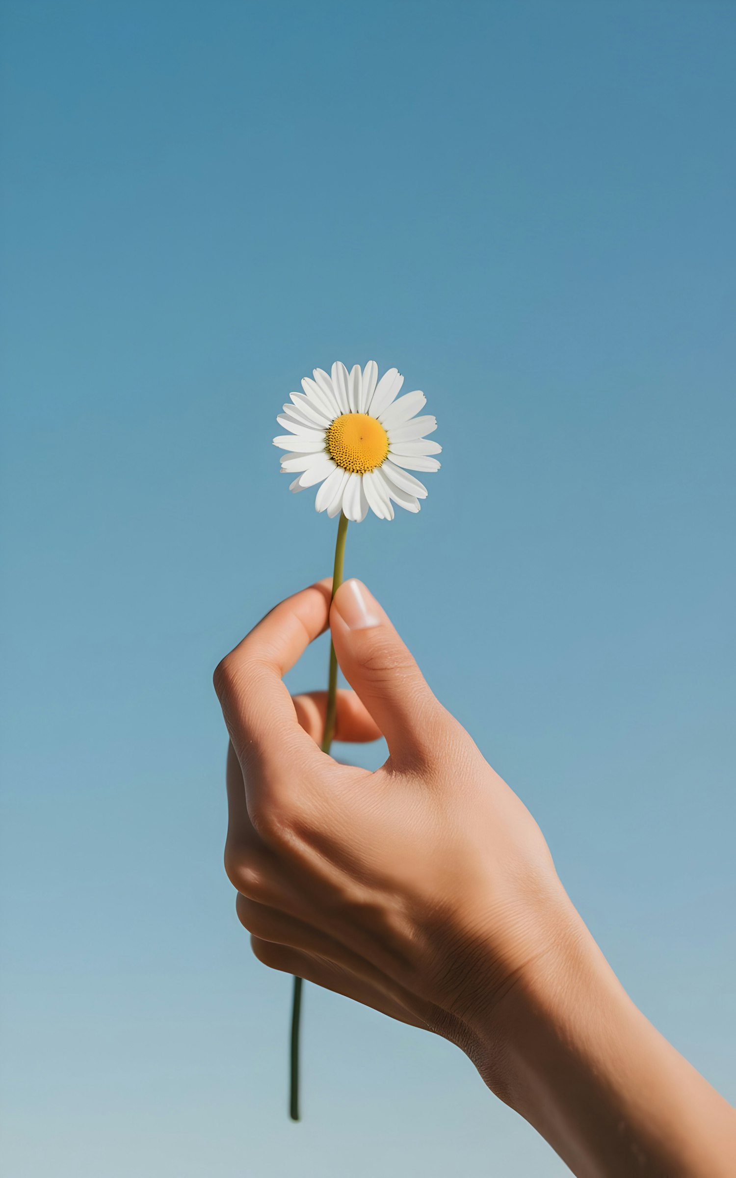 A hand holding a single daisy flower against a clear blue sky, showcasing simplicity and natural beauty in a serene setting.