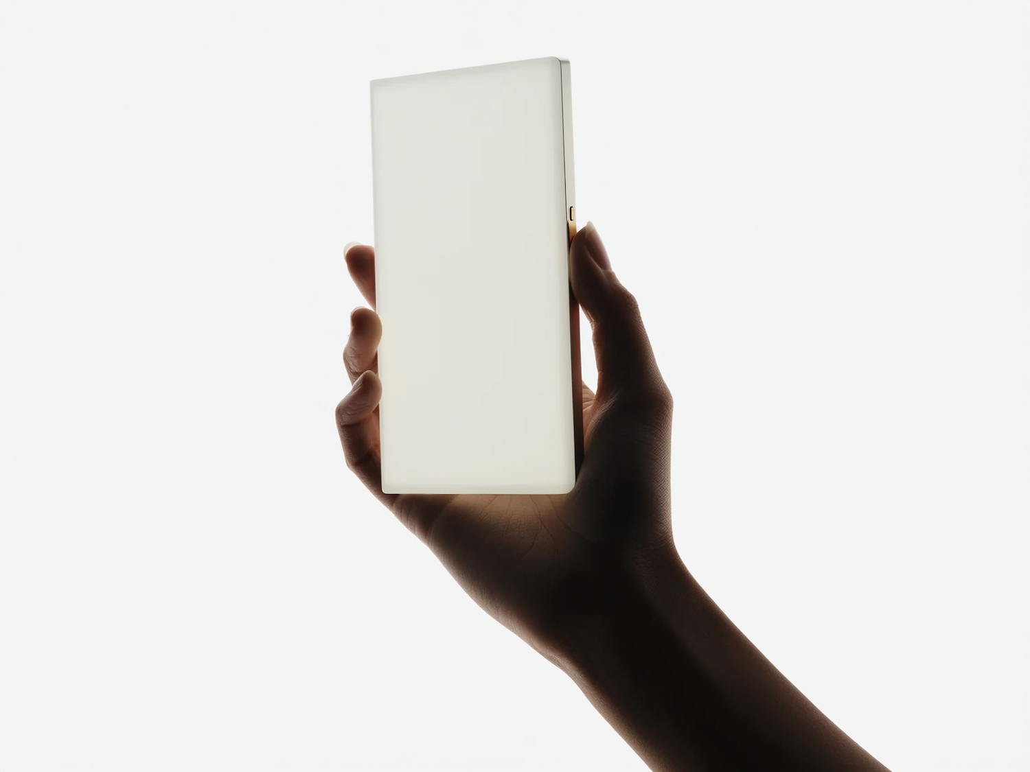 A hand holding a sleek, minimalistic rectangular device against a clean white background, showcasing its modern and slim design.