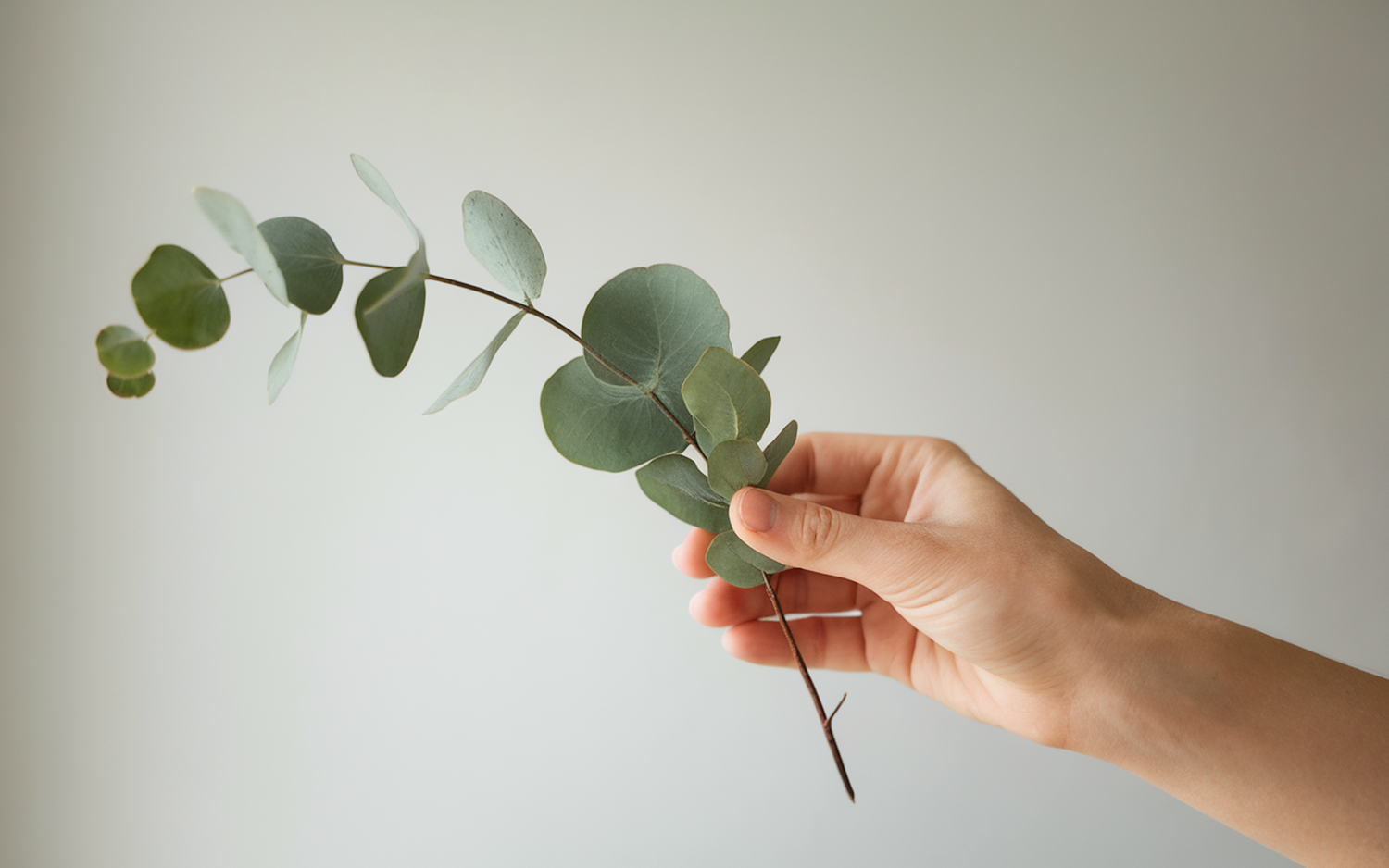 A hand holding a sprig of eucalyptus against a light background, showcasing minimalistic beauty and natural elegance.