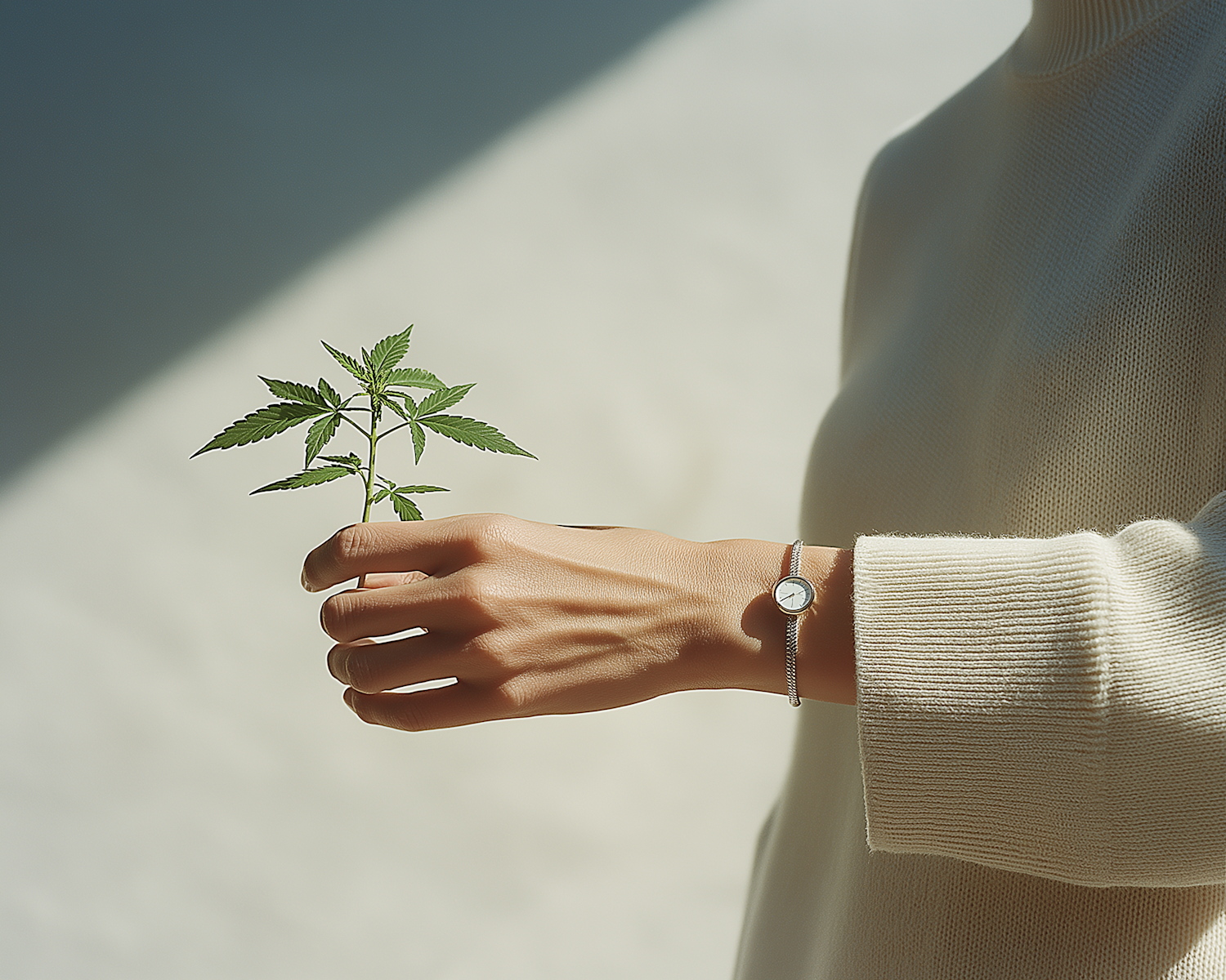 A hand holding a small green plant, wearing a silver watch, against a softly lit background. Minimalist and natural aesthetic.