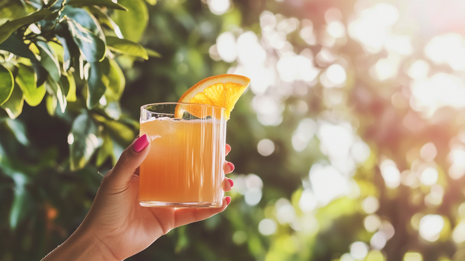 Hand holding a glass of orange juice with a slice of orange, set against a sunny, leafy background.