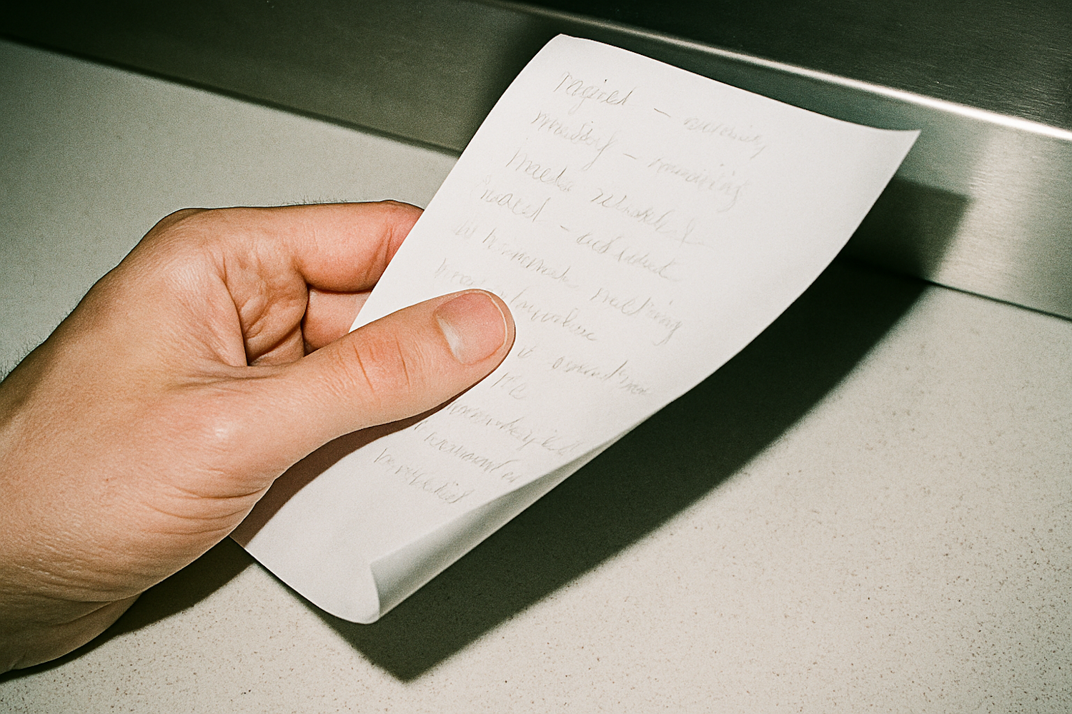 A hand holding a handwritten note against a light surface, with faint cursive writing visible on the paper.