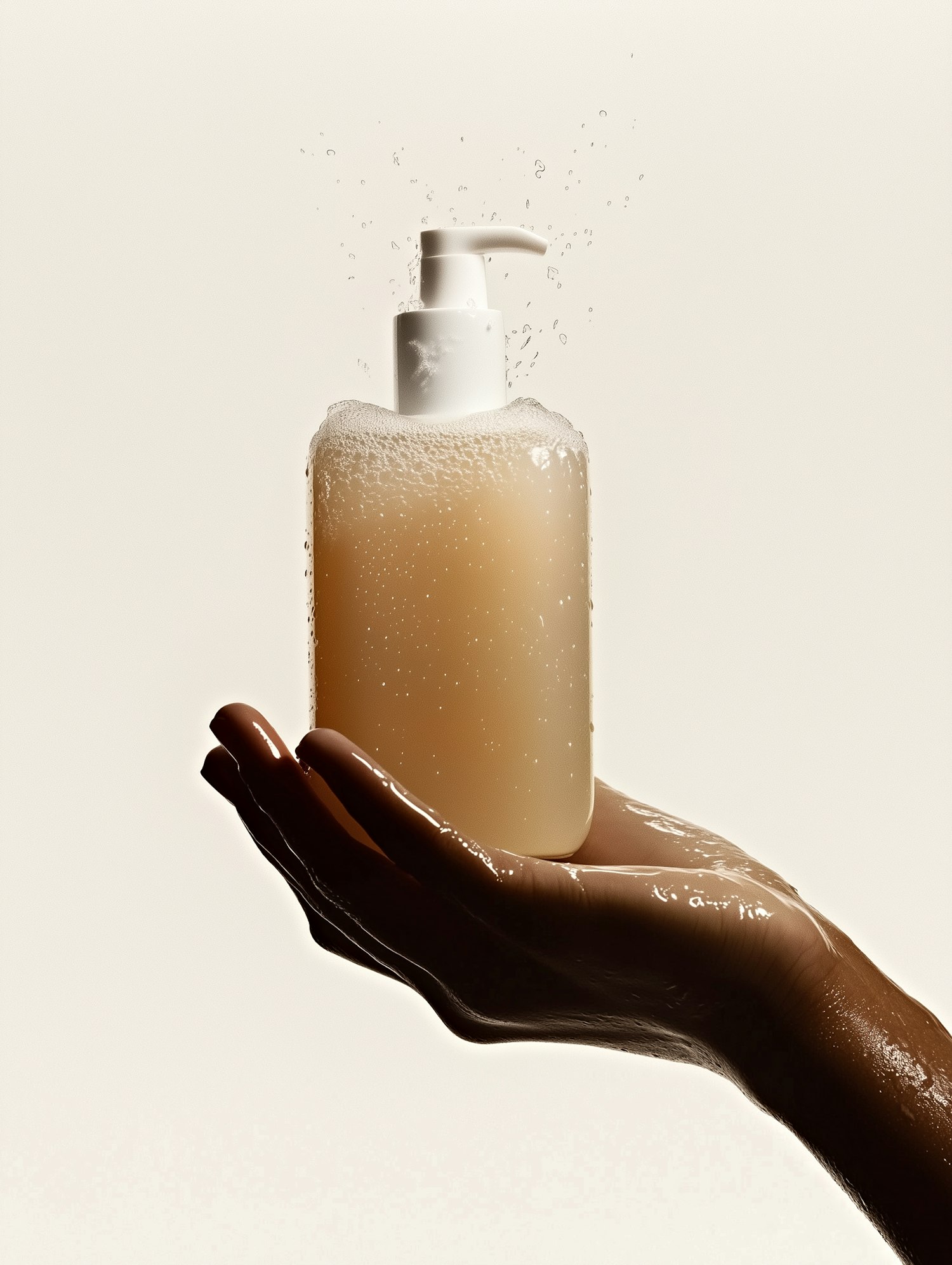 A hand holding a frothy pump bottle with beige liquid, surrounded by water droplets, on a neutral background. Minimalist and refreshing.
