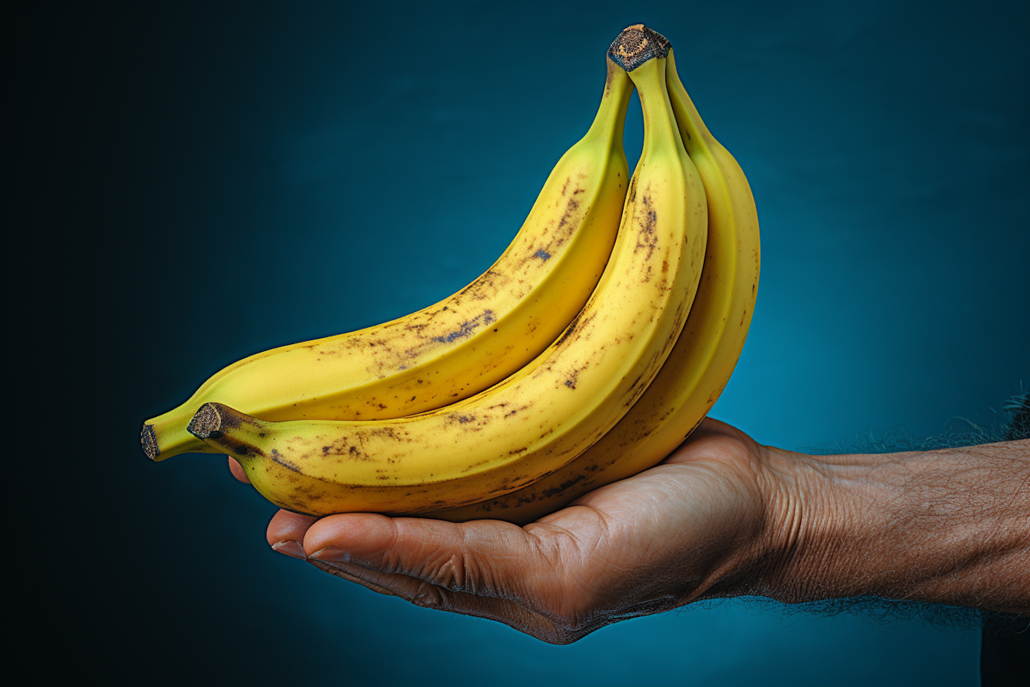 A hand holding a ripe bunch of bananas against a teal background, highlighting the vibrant yellow and brown speckles.