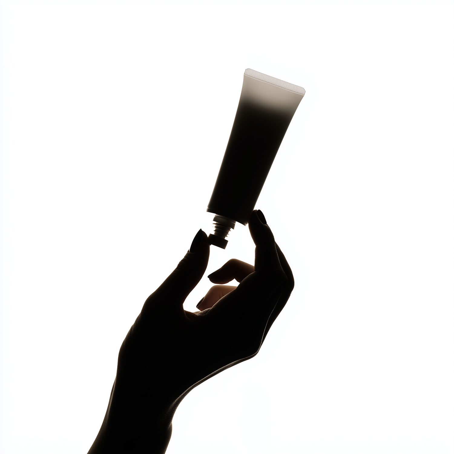 Minimalist silhouette of a hand holding a cosmetic tube against a bright white background, emphasizing light and shadow contrast.