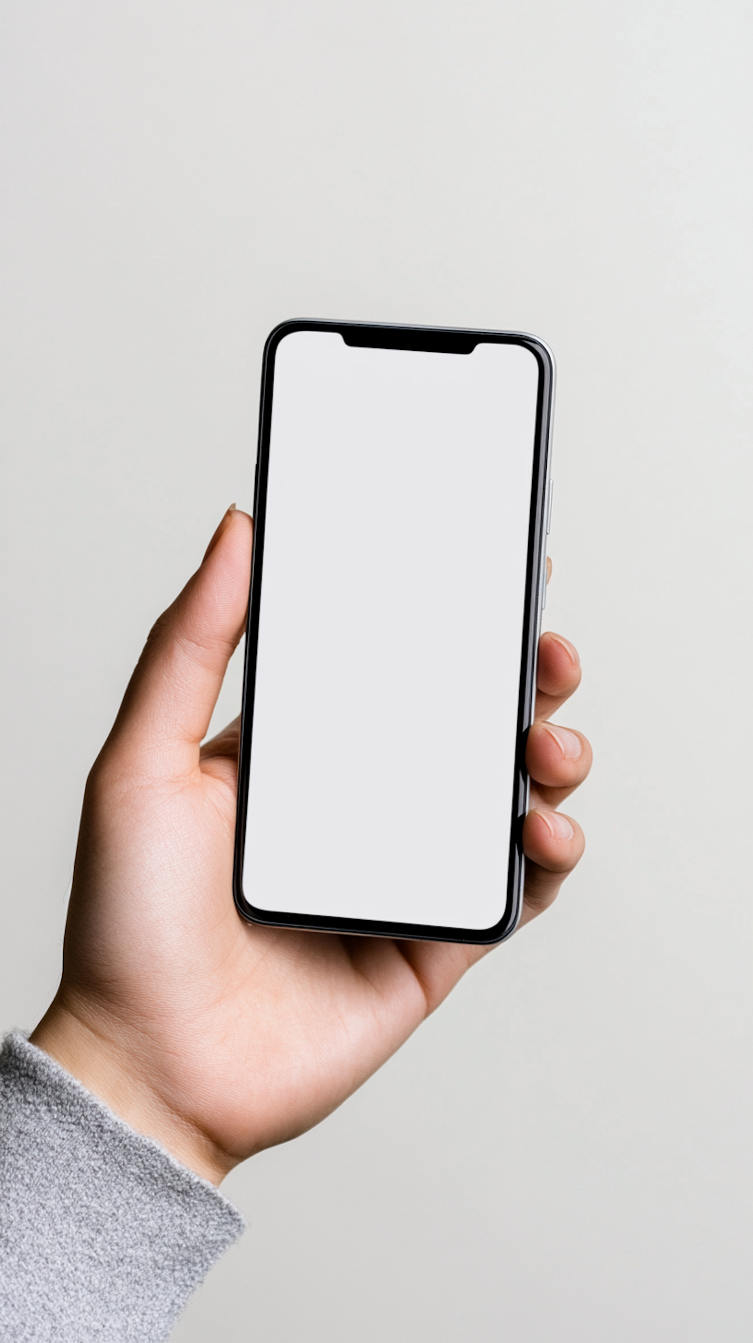 Hand holding a modern smartphone with a blank screen against a light gray background, showcasing a minimalist design.