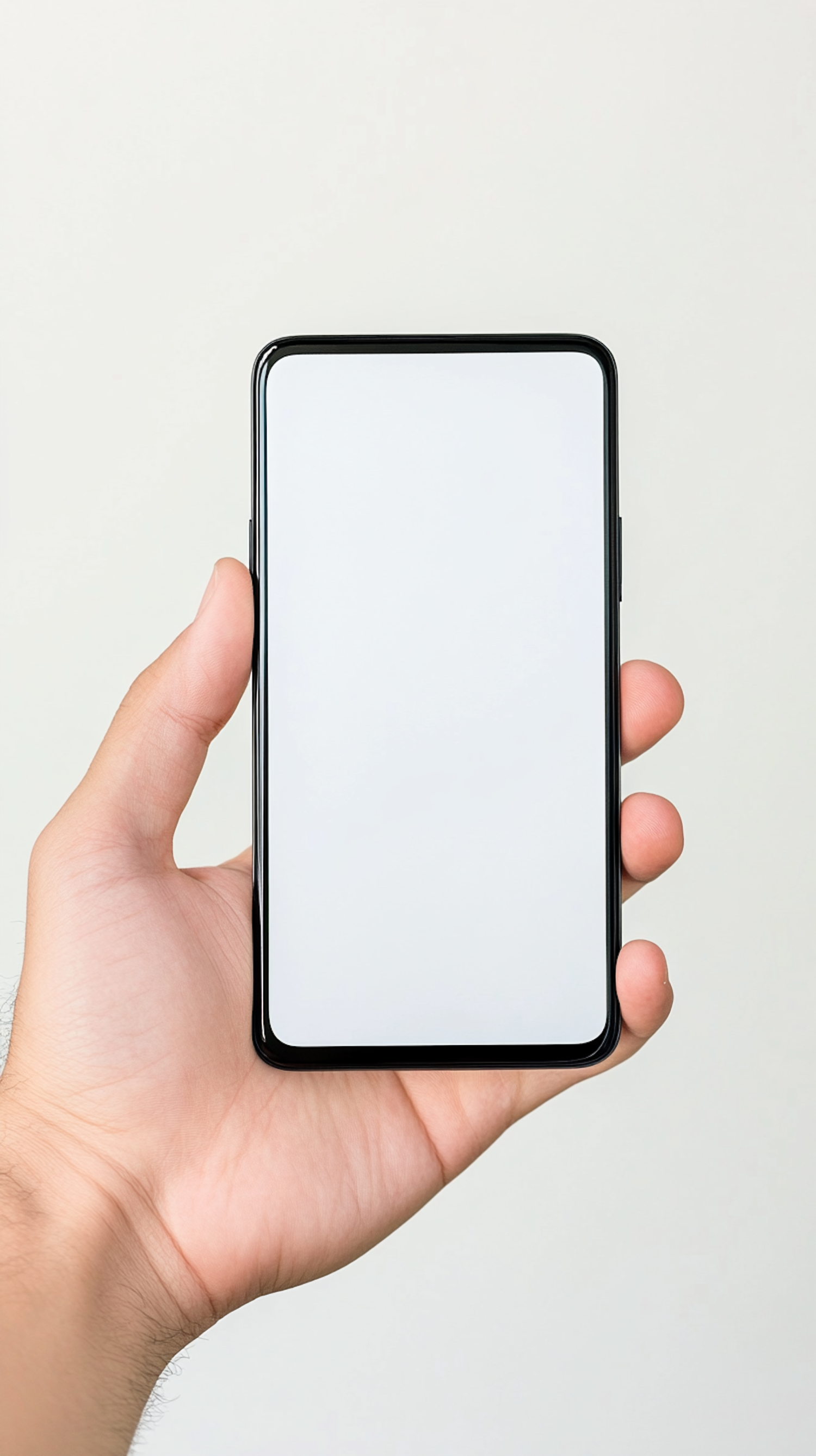 Hand holding a sleek black smartphone with a blank screen against a light gray background.