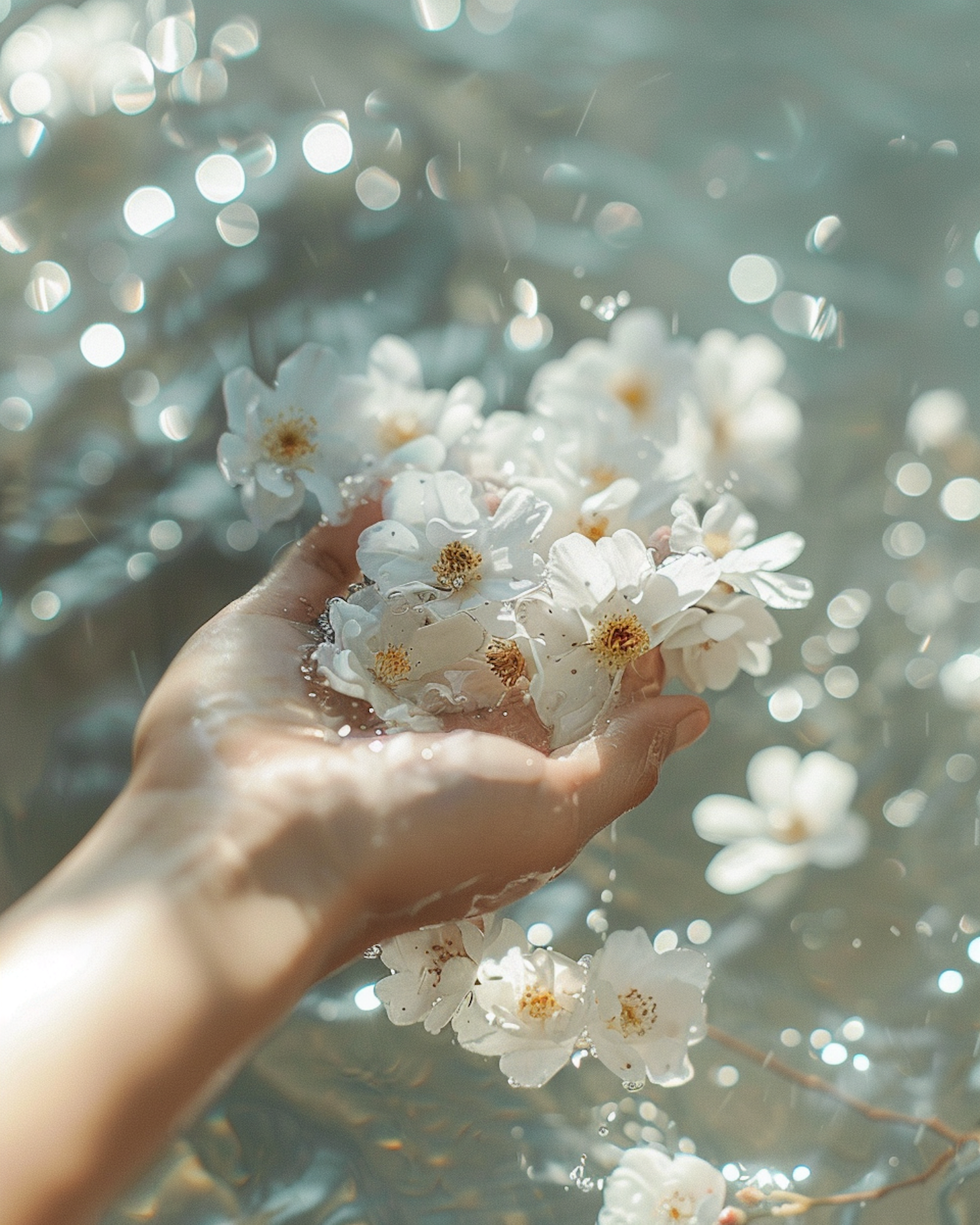 A hand gently holds white flowers over shimmering water, creating a serene and ethereal scene with soft light and bokeh effects.