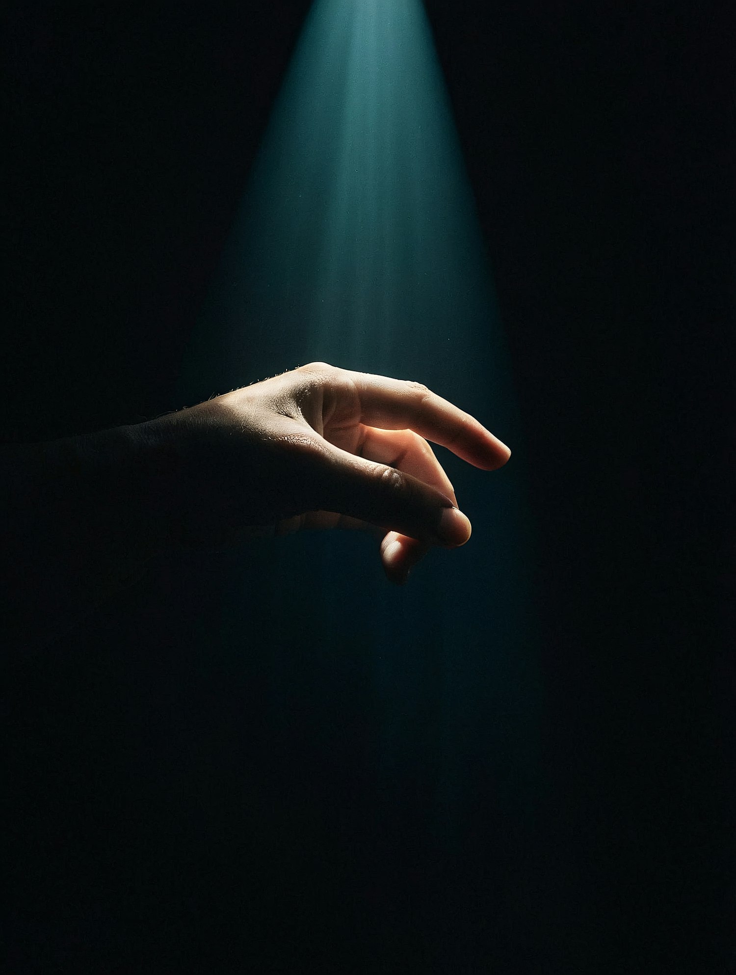 A softly lit hand reaching out in a dark, dramatic setting with a focused beam of light highlighting its contours.