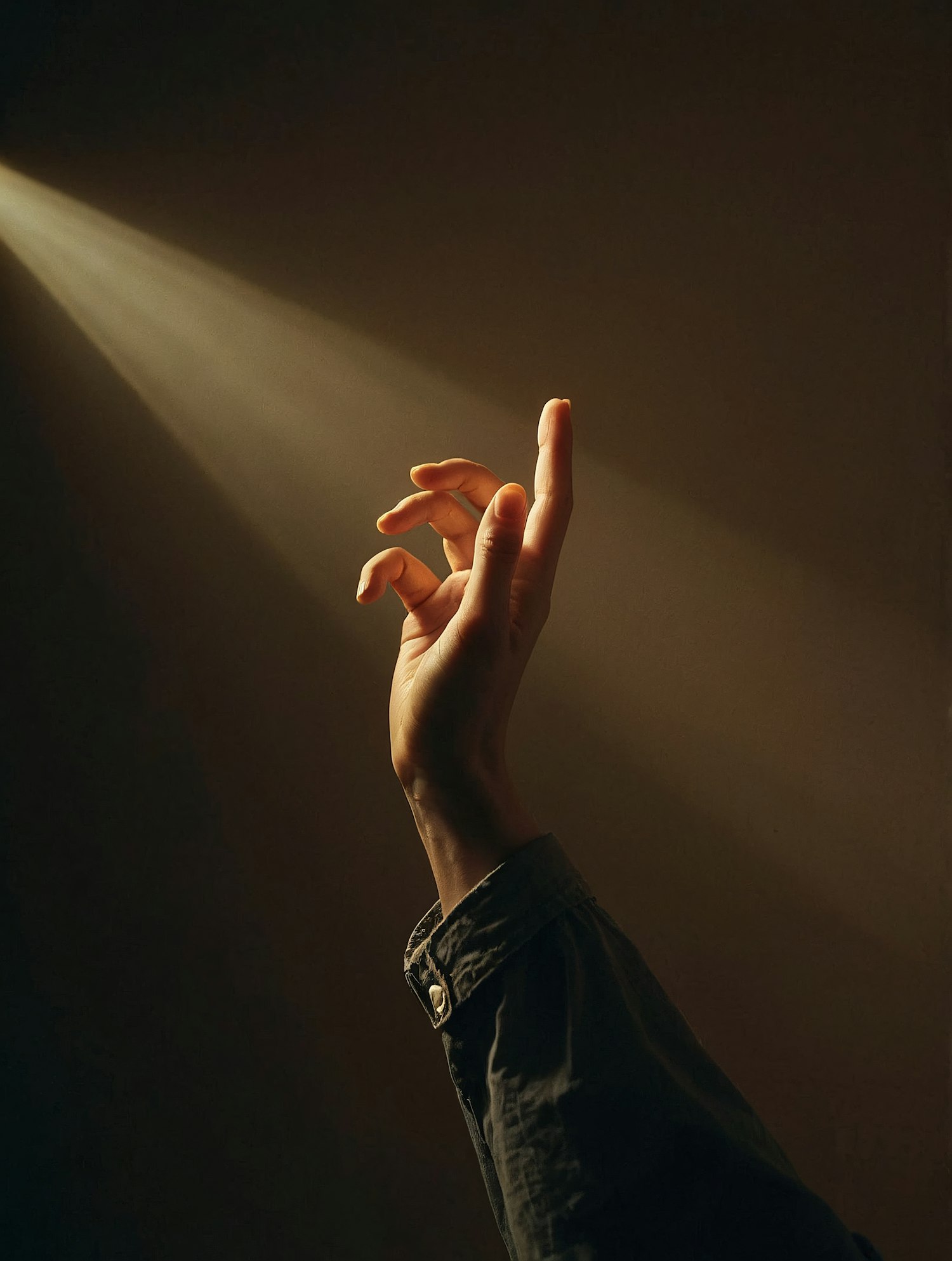 A hand reaches towards a warm beam of light in a dark, minimal setting, creating a serene and dramatic atmosphere.