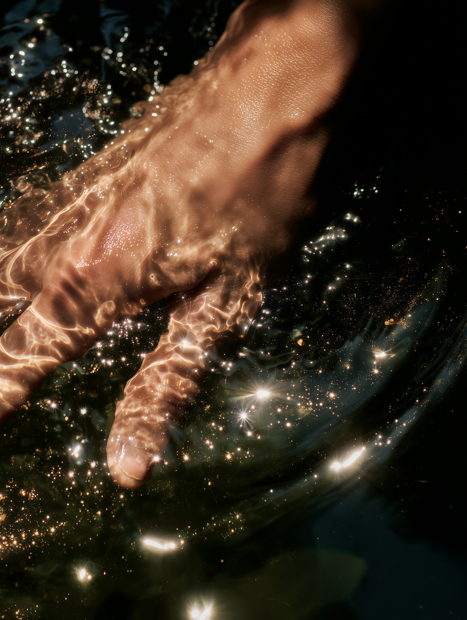 A hand submerged in sparkling water, illuminated by sunlight, creating a mesmerizing play of light and texture.