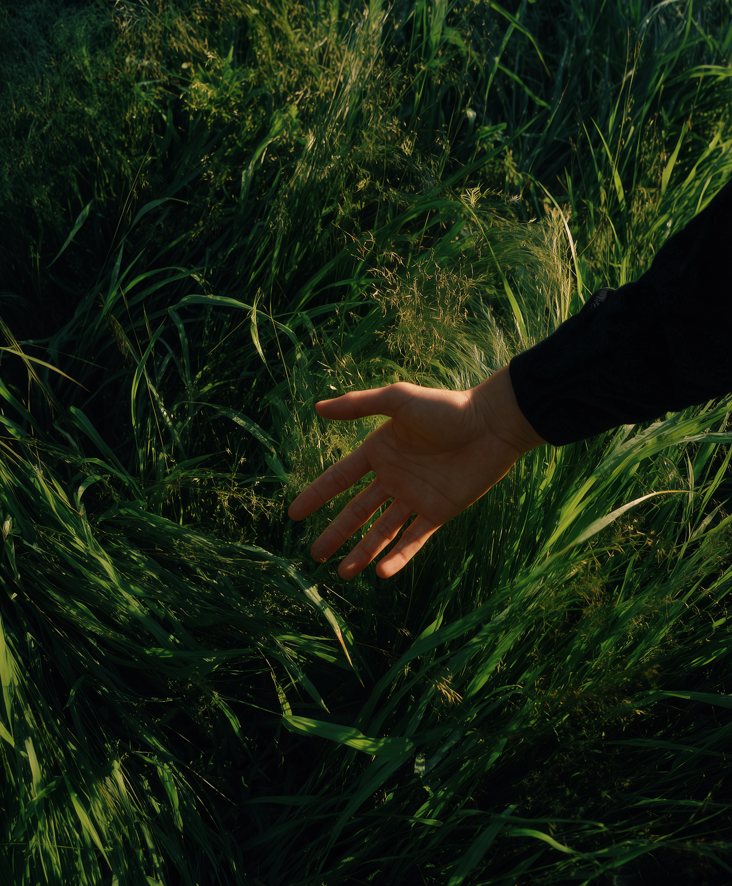 A hand reaching out to touch tall green grass in a sunlit field, capturing a serene and natural moment in vibrant greenery.