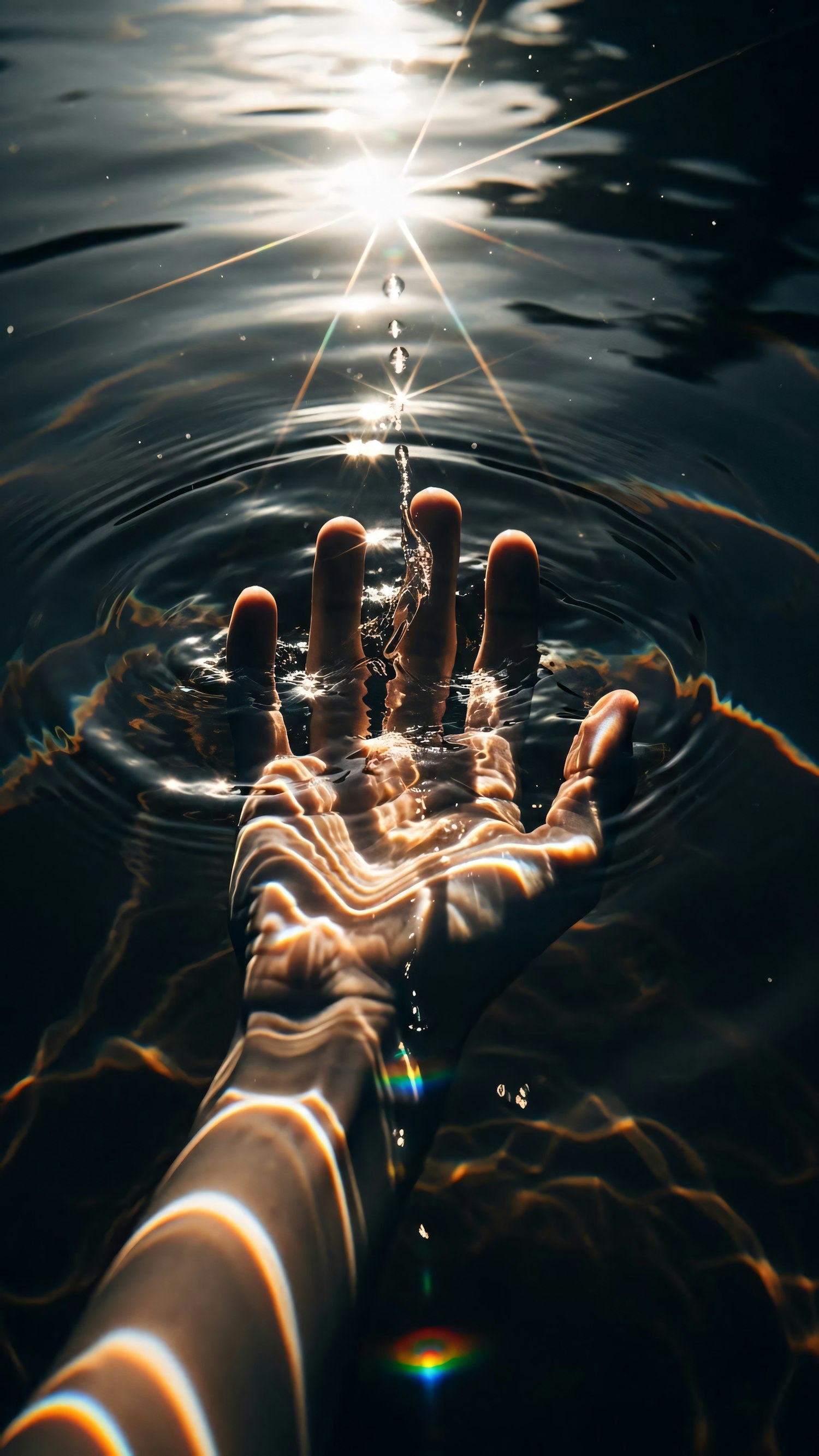 A hand submerged in water with sunlight reflecting off ripples, creating a stunning interplay of light and shadow.