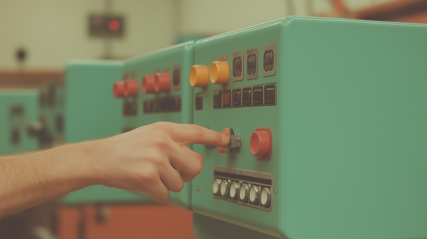 Hand pressing a button on a vintage teal control panel with red and yellow buttons, evoking a retro industrial feel.