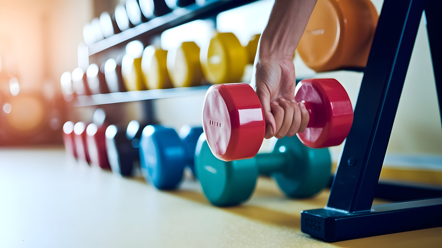 Close-up of a hand lifting a red dumbbell from a colorful rack, perfect for fitness and gym inspiration.