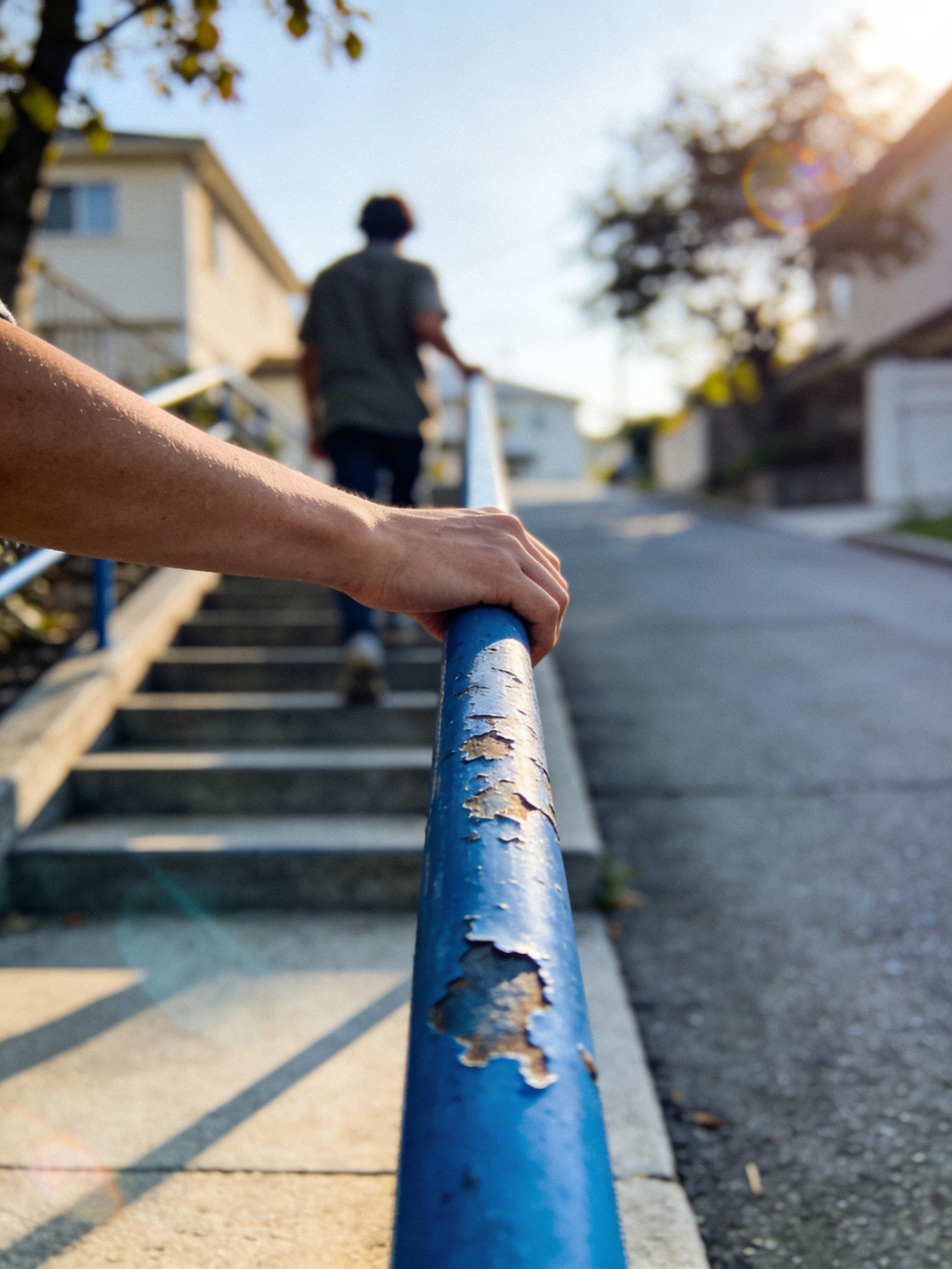 A hand grips a weathered blue railing as a person walks up stairs in a sunny suburban setting, with a warm and casual atmosphere.