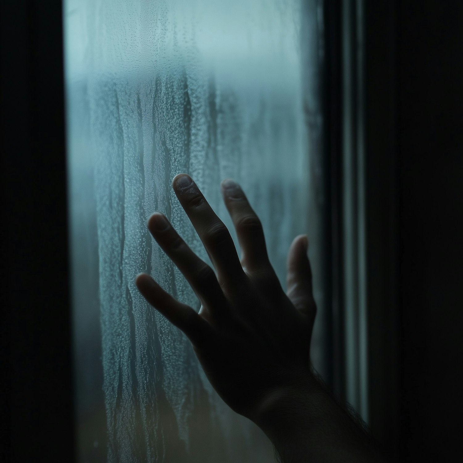 A hand pressed against a foggy glass window with water streaks, creating a moody and introspective atmosphere.