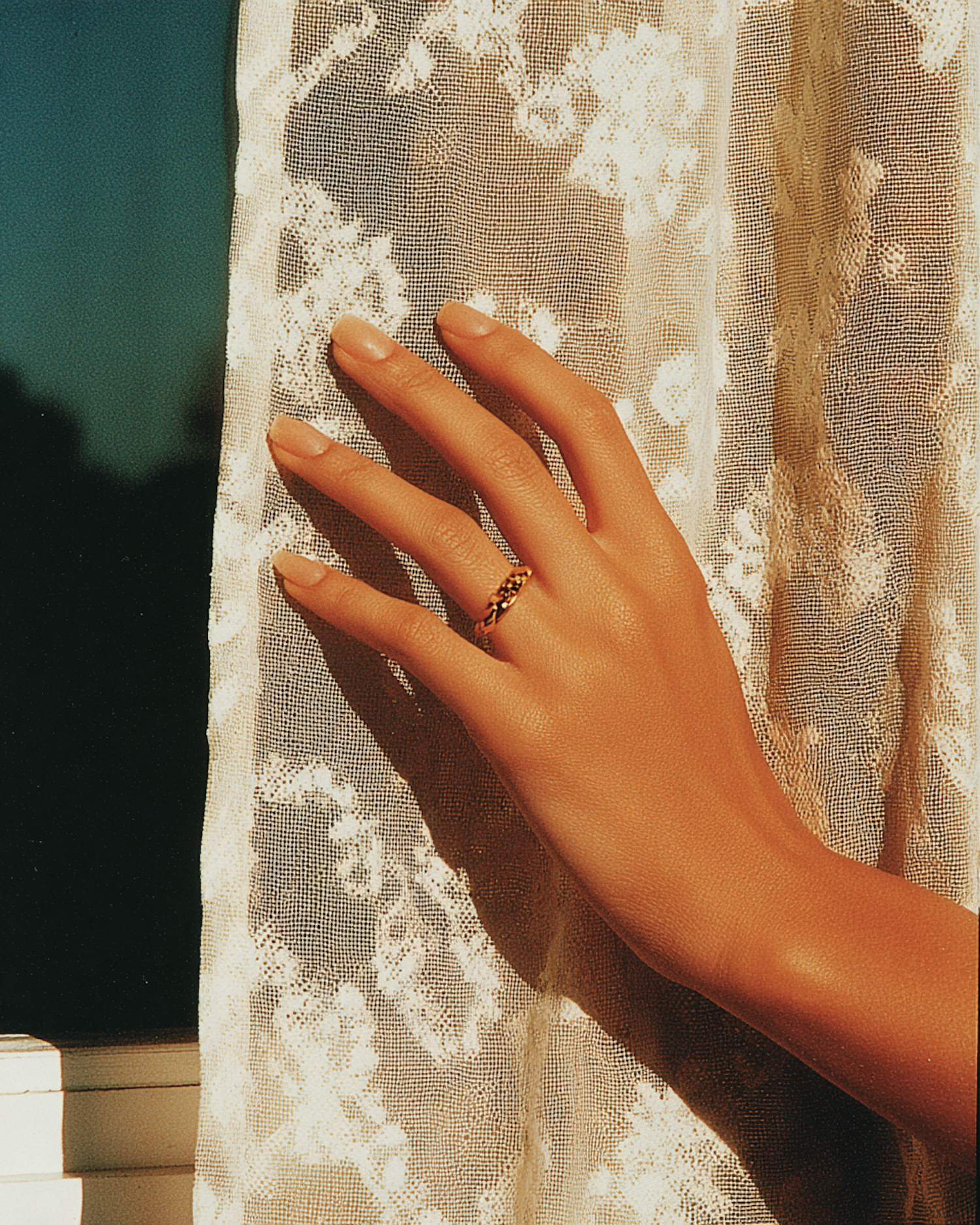 A close-up of a hand with a gold ring resting on a lace curtain, illuminated by warm sunlight, creating a serene and elegant scene.