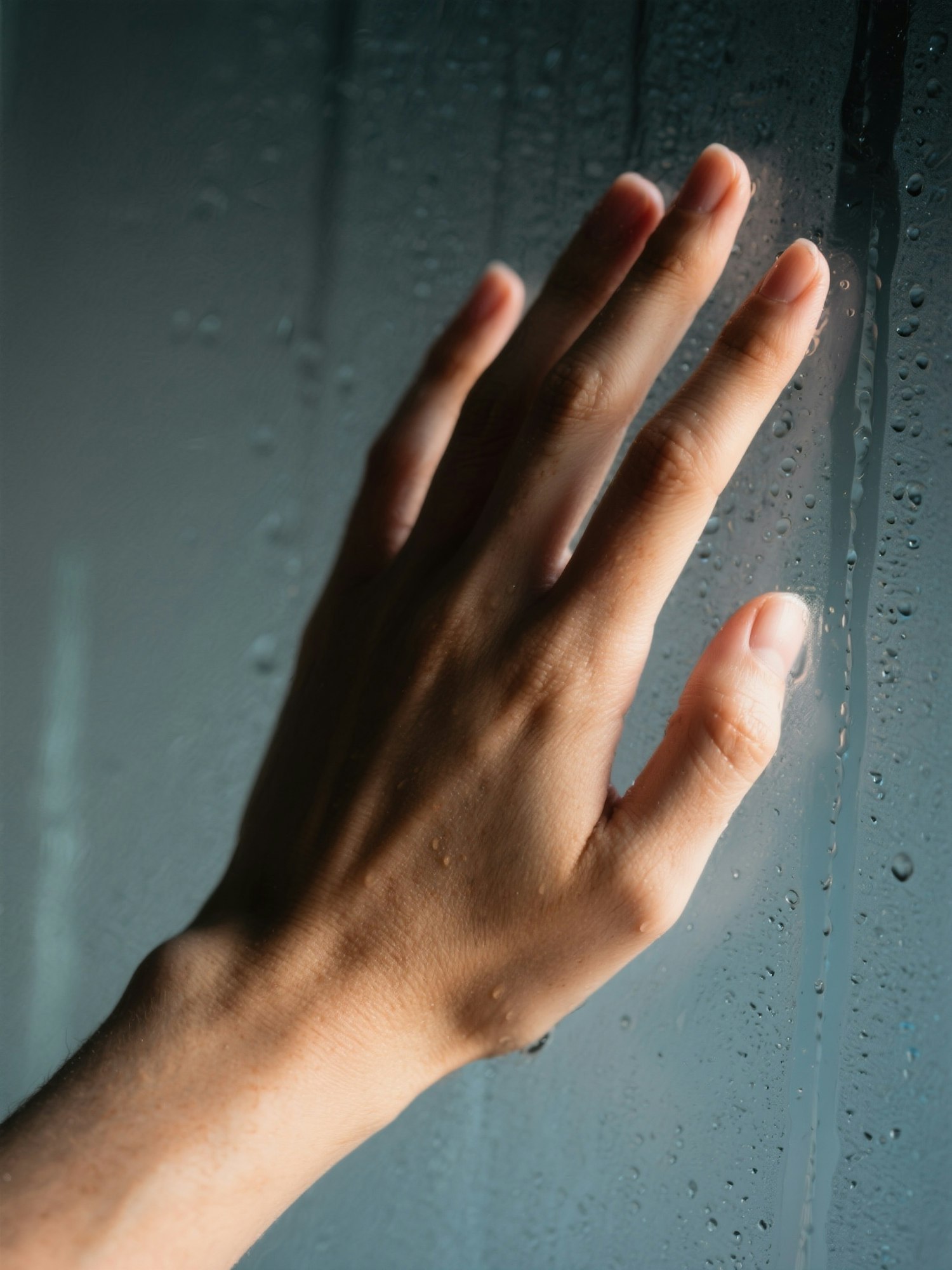 A raw editorial studio aesthetic with a minimalist setup, soft natural lighting, deep shadows and close-up framing. Focus on skin texture, intimate gestures and expressive body parts. Moody and sensual atmosphere, with realistic tones and subtle color grading. A hand pressed flat against foggy glass, with water droplets and skin texture visible, evoking tension and intimacy.