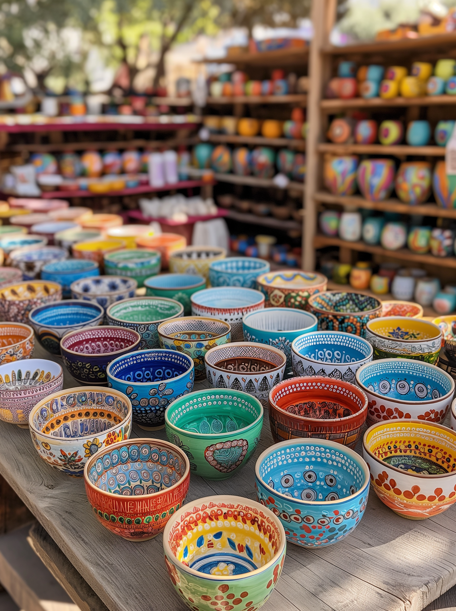 Colorful ceramic bowls with intricate patterns displayed at an outdoor market, creating a vibrant and artistic scene.