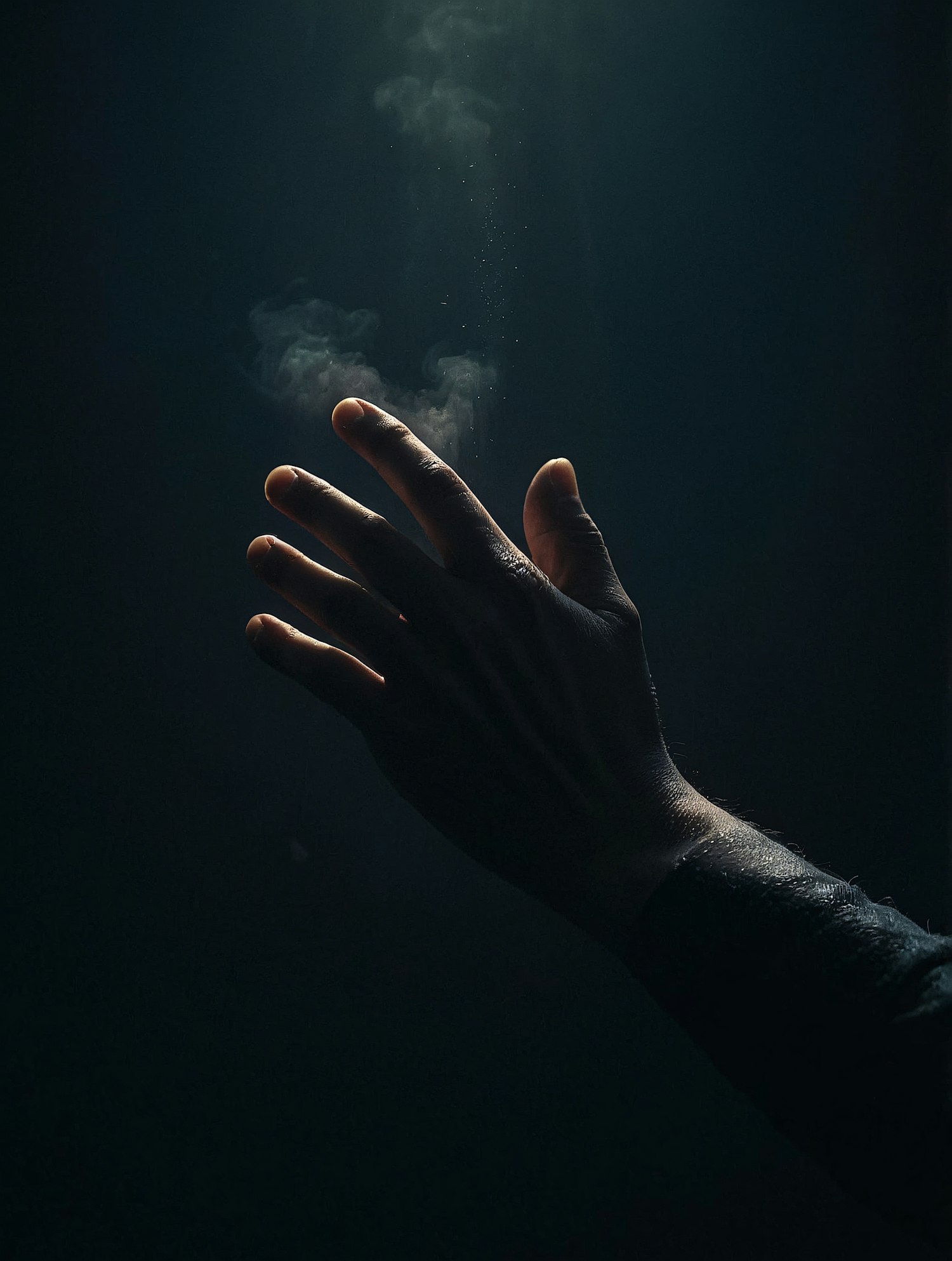 A hand reaching upward in dim light, surrounded by soft mist, creating a moody and ethereal atmosphere against a dark background.