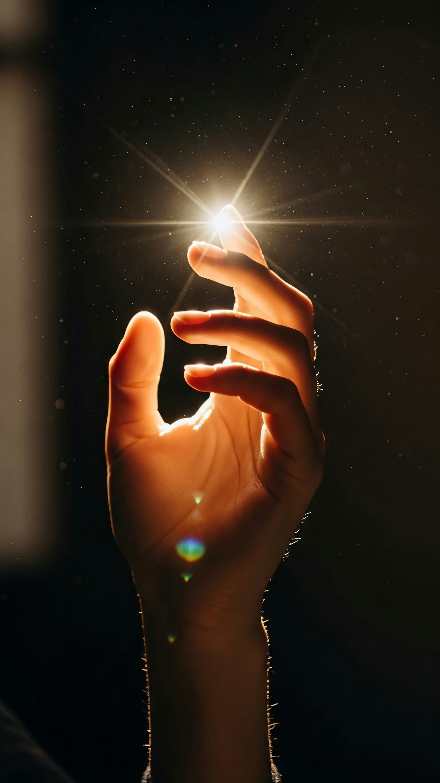 A hand reaches towards a glowing light, with warm tones and a dramatic dark background, creating a serene and contemplative atmosphere.