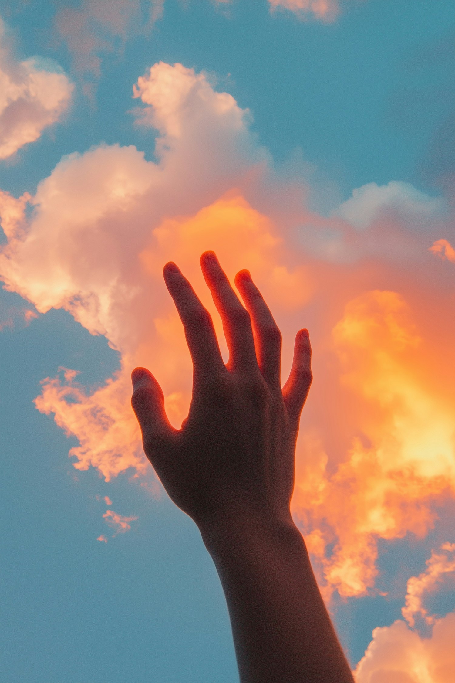 A silhouetted hand reaches toward glowing orange and pink clouds in a vibrant blue sky, creating a dreamy and aspirational scene.