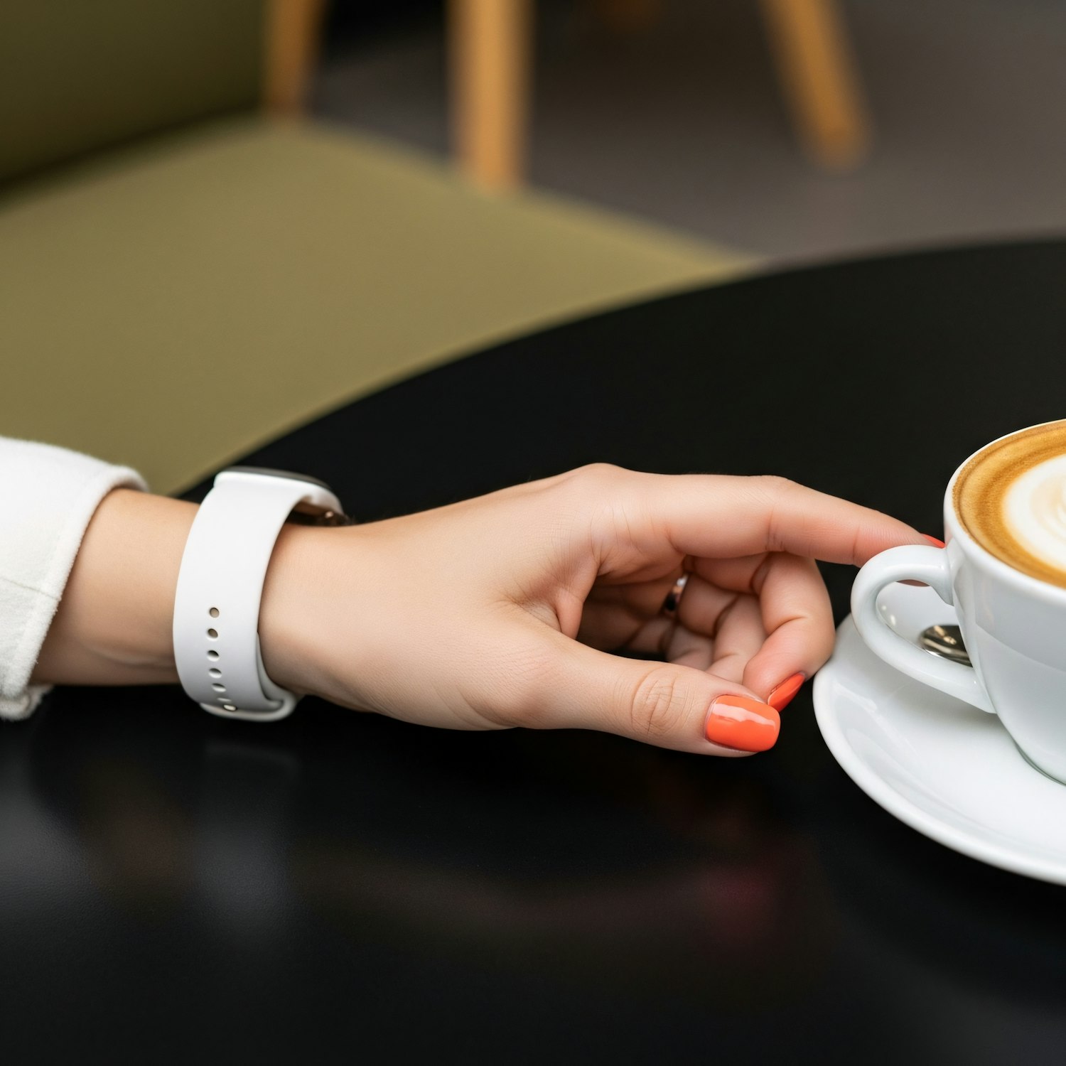 Close-up of a hand with orange nails and a white smartwatch reaching for a cappuccino on a black table in a cozy café setting.