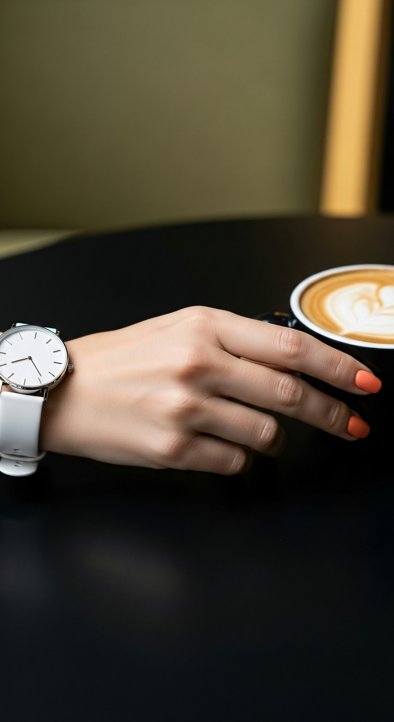 A hand with orange nails and a white watch holding a coffee cup with latte art, set against a dark table and blurred background.