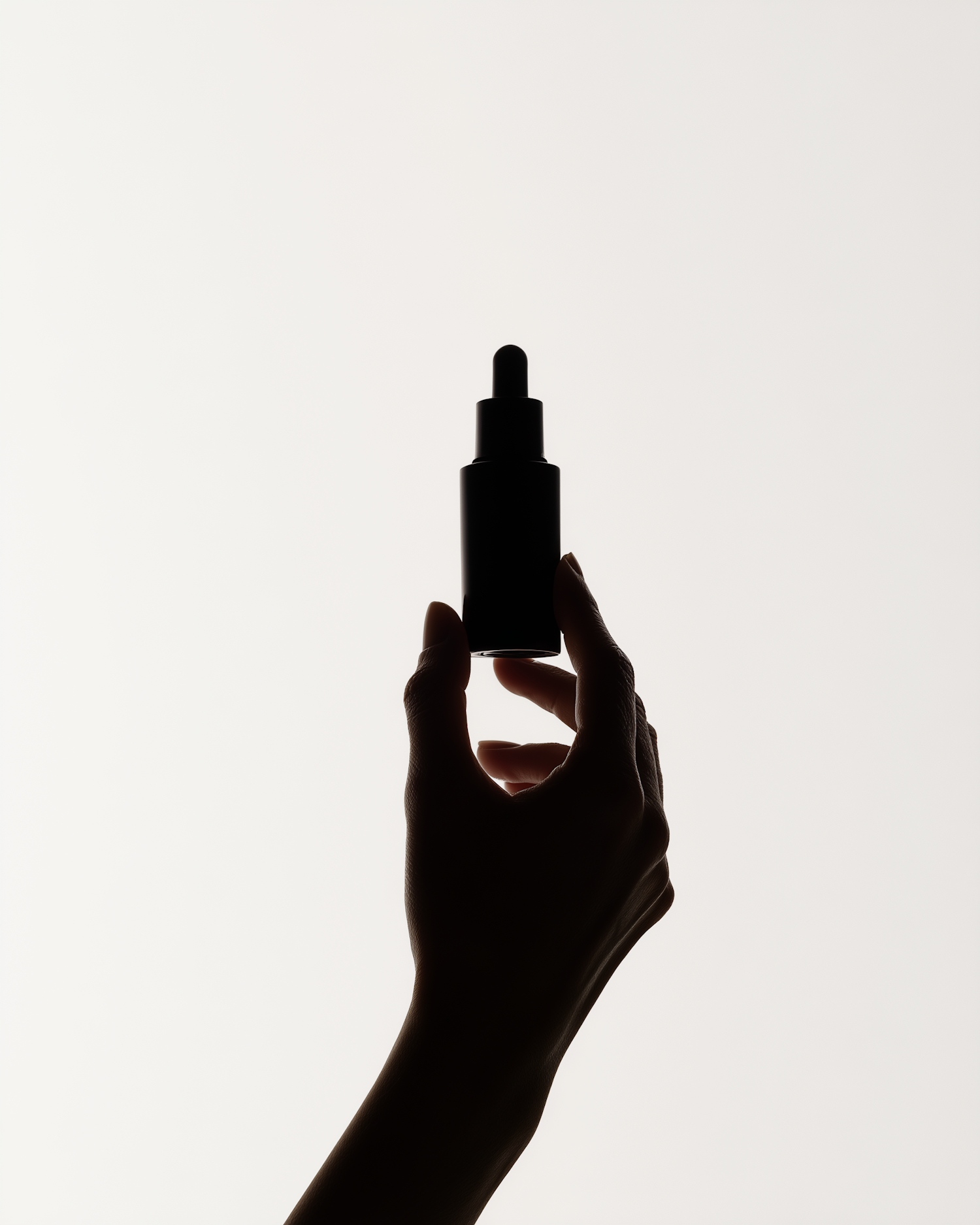 Silhouette of a hand holding a sleek black dropper bottle against a bright background, creating a minimalist and elegant aesthetic.