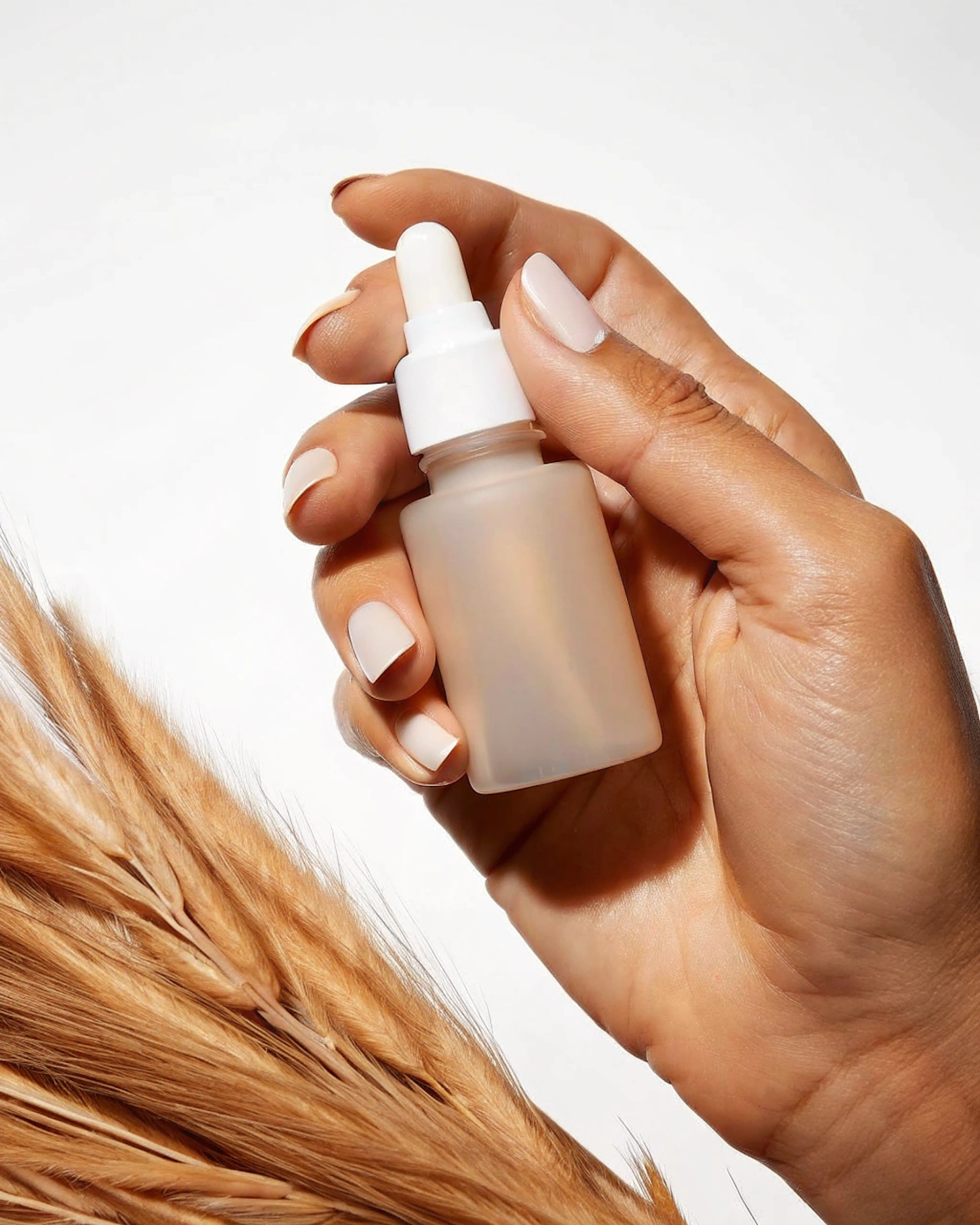Hand holding a frosted glass dropper bottle with a white cap, set against a minimal background with dried wheat stalks.