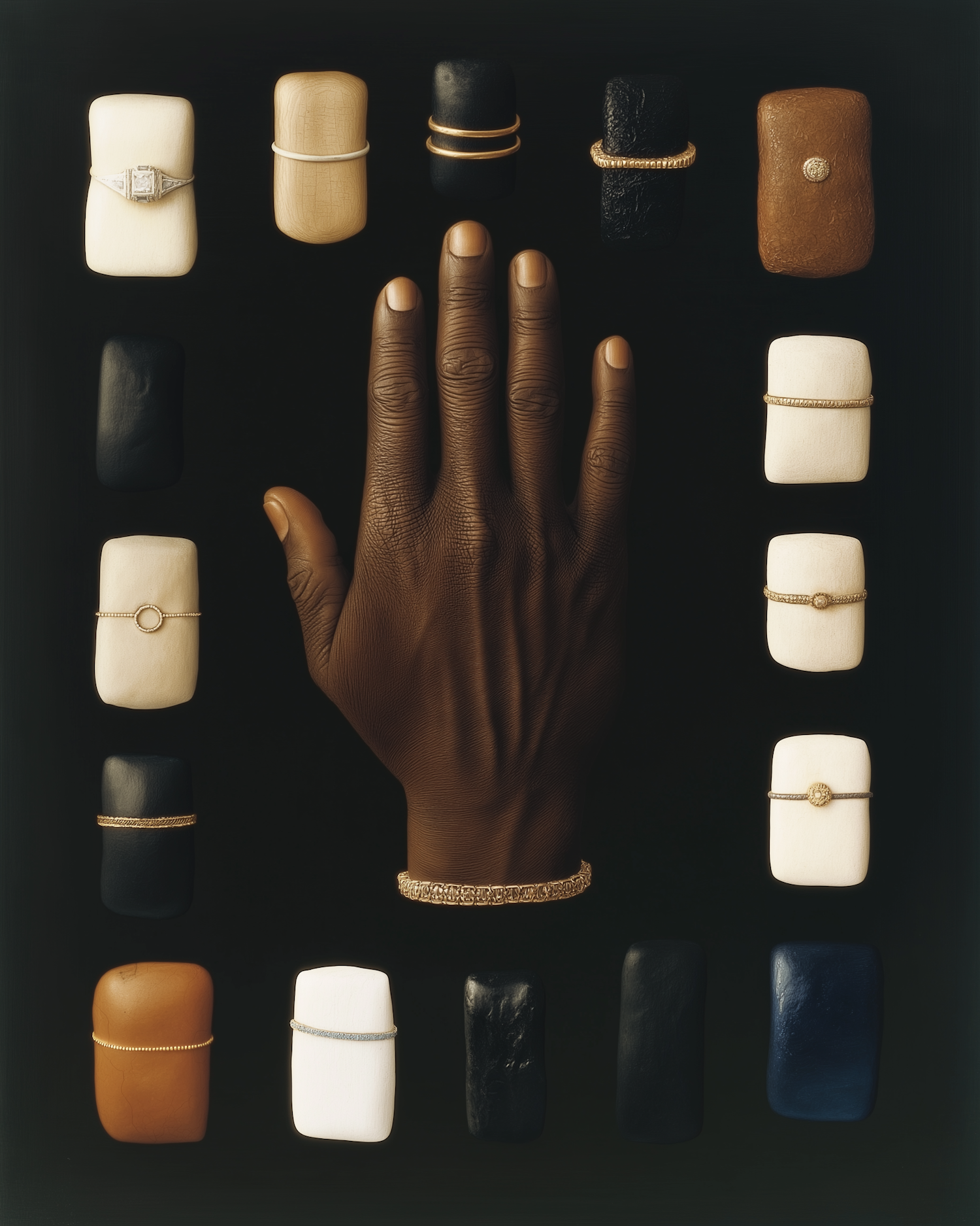 A dark-skinned hand with a gold bracelet is surrounded by textured objects, each adorned with unique rings and bracelets on a black background.
