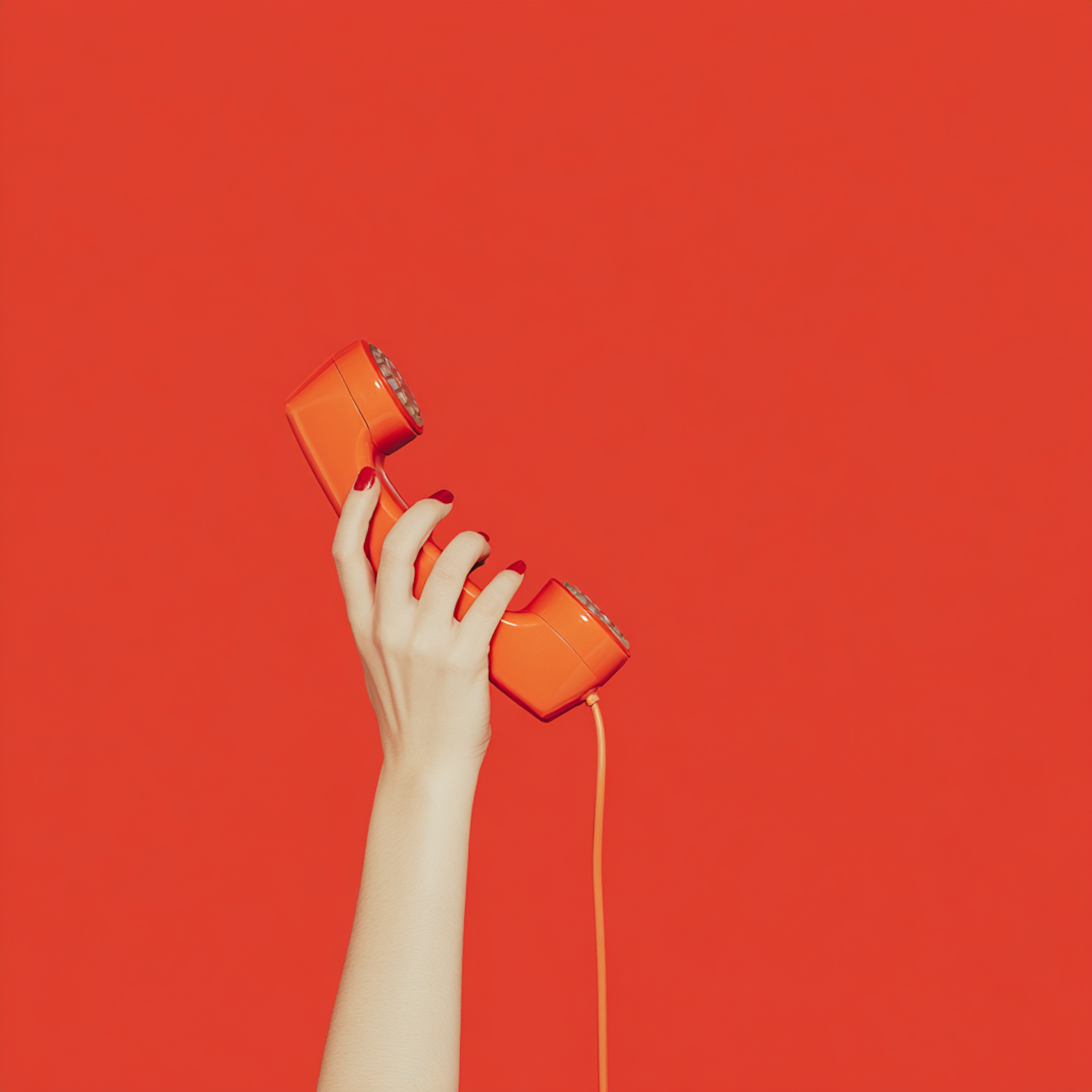 A hand with red nails holds a vintage-style red telephone receiver against a bold red background, creating a striking color harmony.