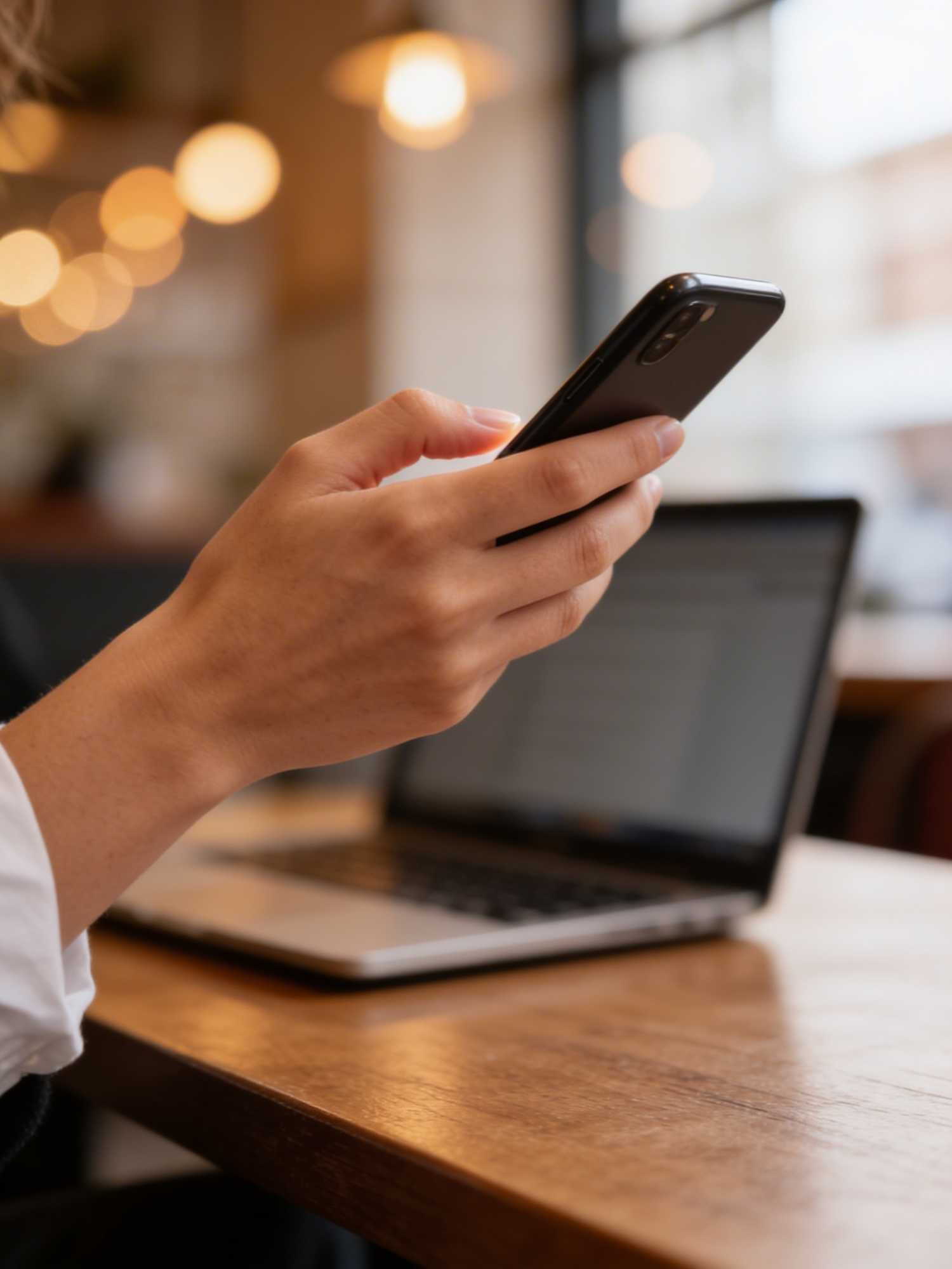 A hand holding a smartphone with a laptop on a wooden table in a warmly lit indoor setting, suggesting a cozy and productive environment.
