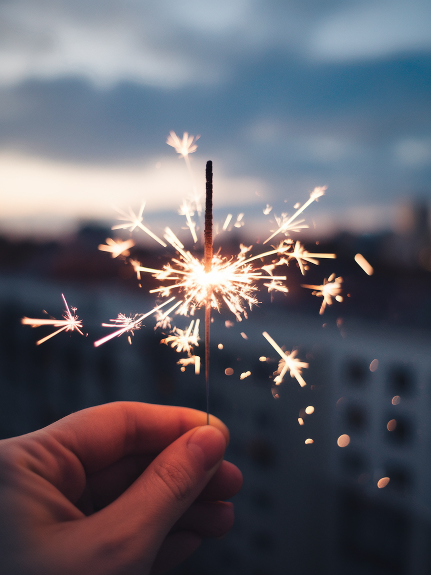 A hand holding a lit sparkler against a blurred cityscape, creating a warm, festive glow with a dreamy bokeh background.
