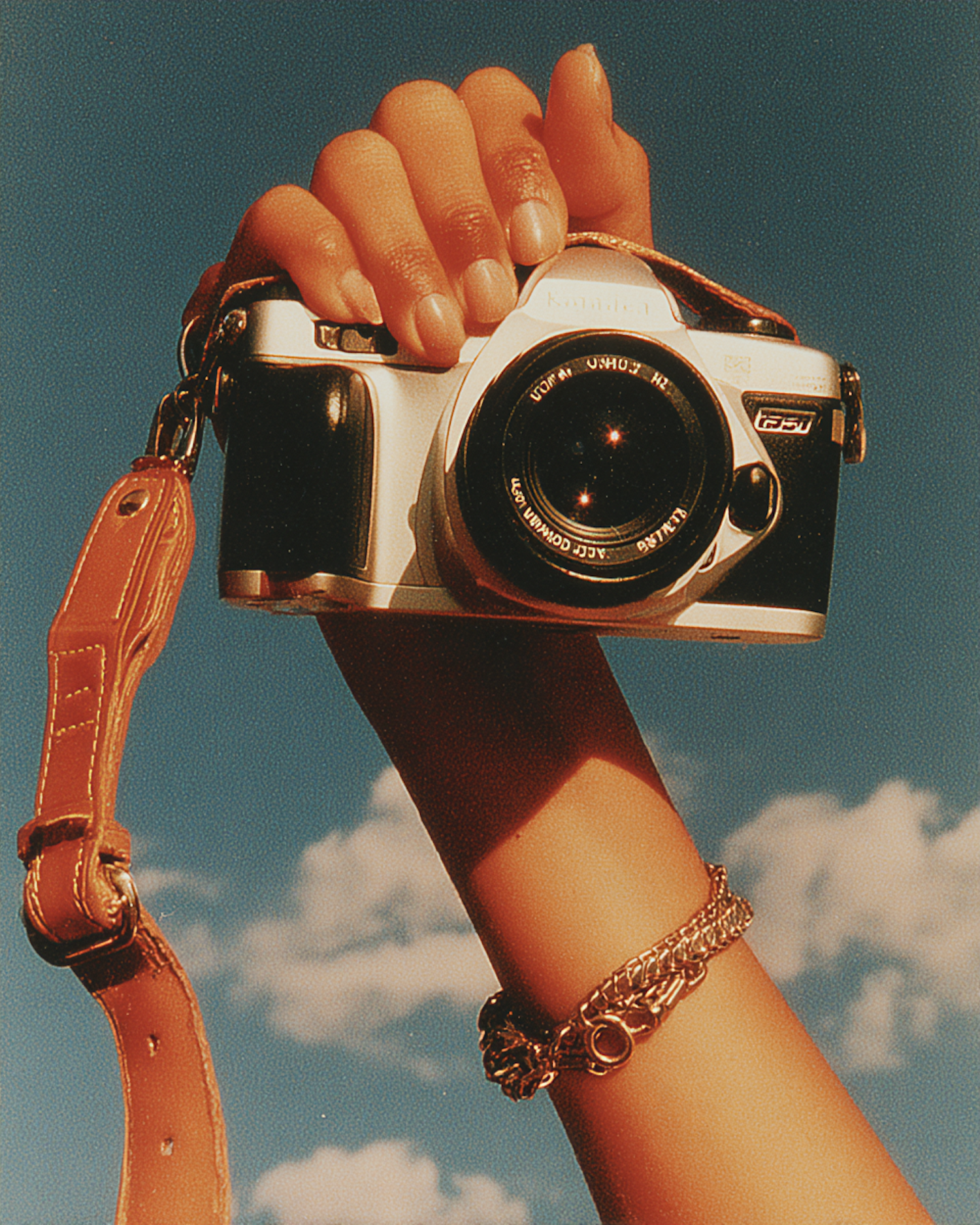 A hand holding a vintage camera with a leather strap, set against a clear blue sky with clouds. A gold bracelet adds a touch of elegance.