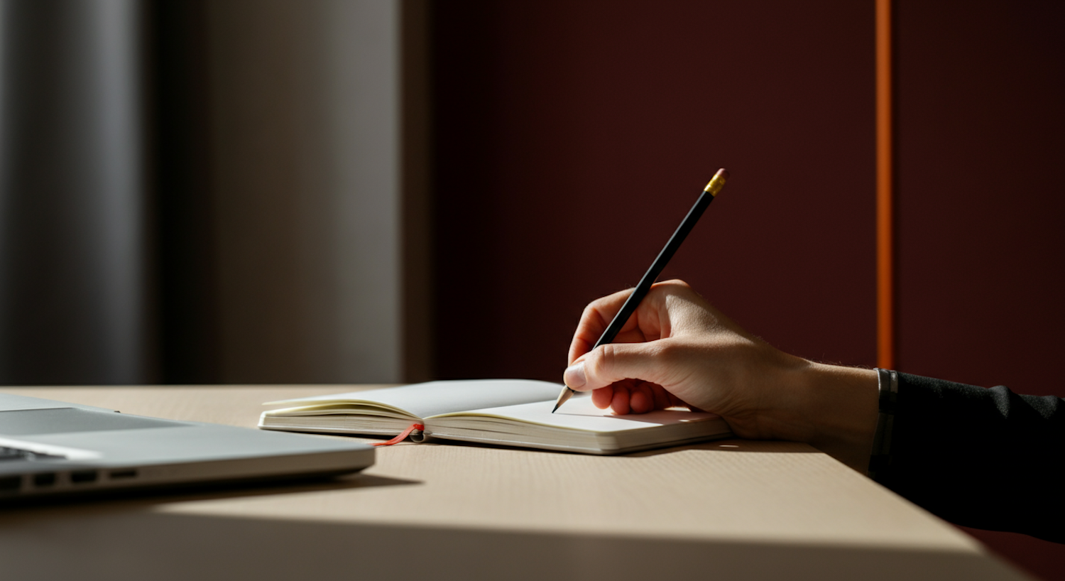 A hand writing in a notebook with a pencil on a desk, next to a closed laptop. Soft lighting creates a focused atmosphere.
